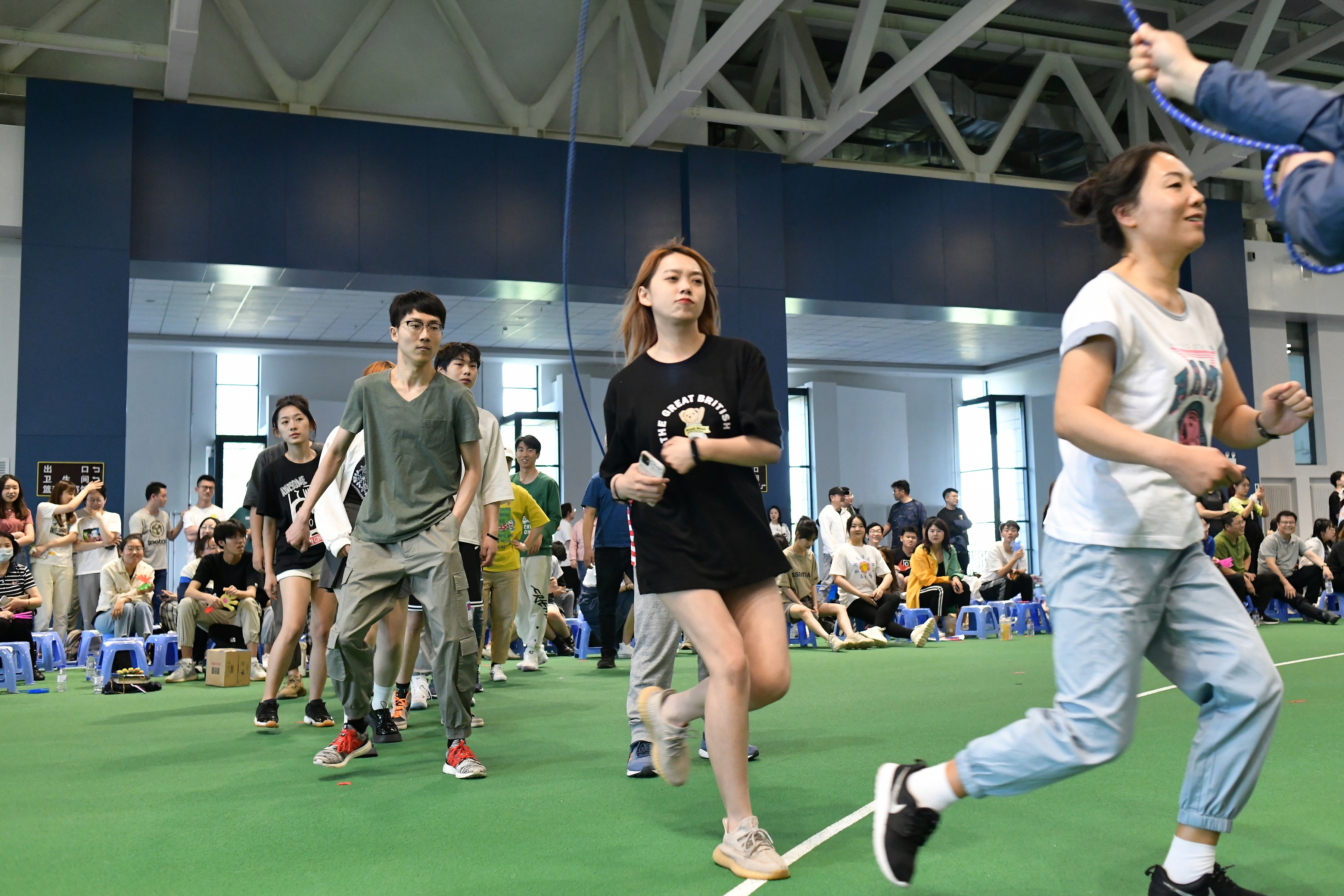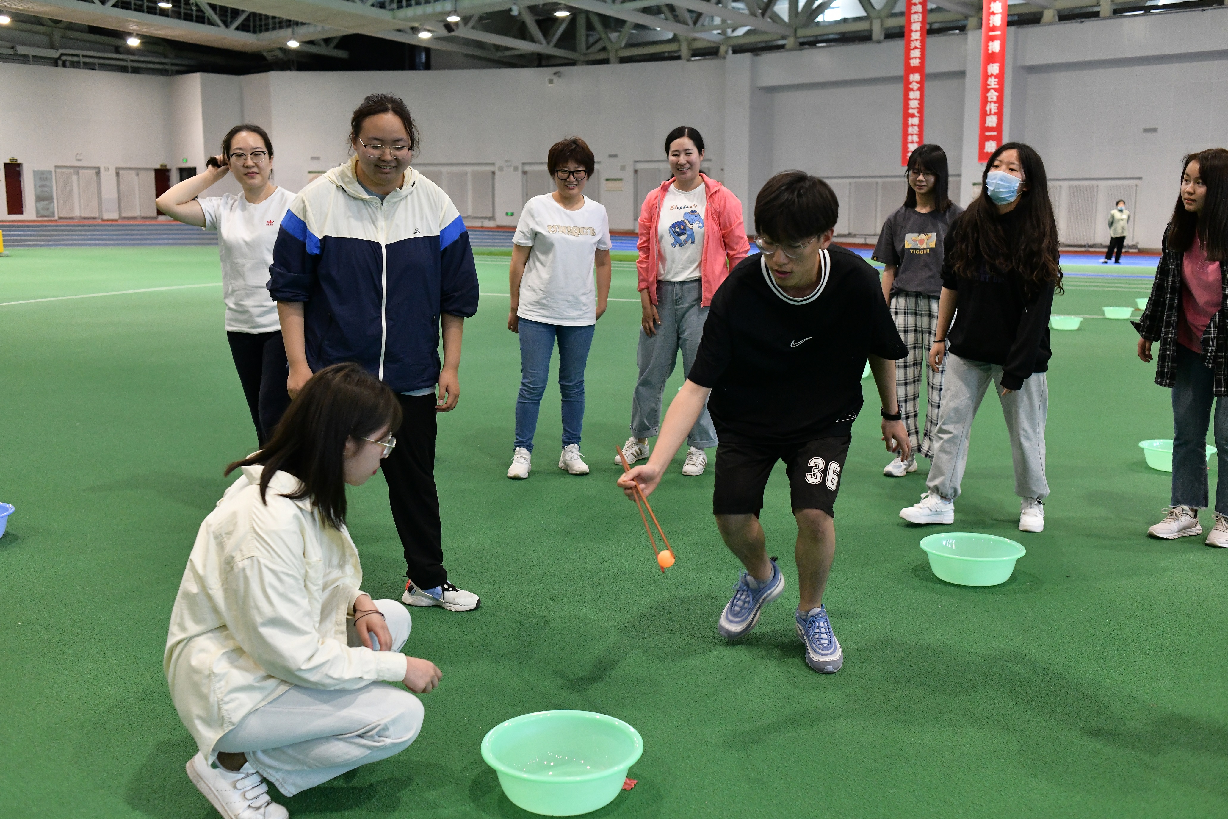 根据赛程设置,第一项为带杆连体旋转,参赛选手按照规则手握长杆,团结协作,全力奔跑,爆发出“1+1>2”的巨大能量;“筷”运乒乓球项目改变了乒乓球的传统打法,采用木筷夹乒乓球的方式相互传递,各支队伍难分伯仲,战况一度陷入焦灼;呼啦圈竞走项目,这是平衡与速度的统一,更是良好的身体素质与心理素质的体现;跳大绳比赛,面对翻飞的长绳,各个战队成员鱼贯而入,流畅迅捷,看似常规的运动却充分考察了运动员们的协调性和默契度,也彰显了经院师生的热忱与活力;螃蟹赛考研运动员的柔韧性基础,以巧妙的战术,和队友默契配合夺取最终的胜利;足接力赛上,参赛师生团结一致,彼此鼓励,为共同目标努力奋斗,场上场下不绝于耳的口号声、呐喊声足以证明他们心中不能平息的激动与喜悦。经过激烈而友好的角逐,国际经济与贸易系战队荣获桂冠,金融系战队和经济系战队荣获二等奖,财政系和行政人员代表队获得了团体第三名的好成绩。