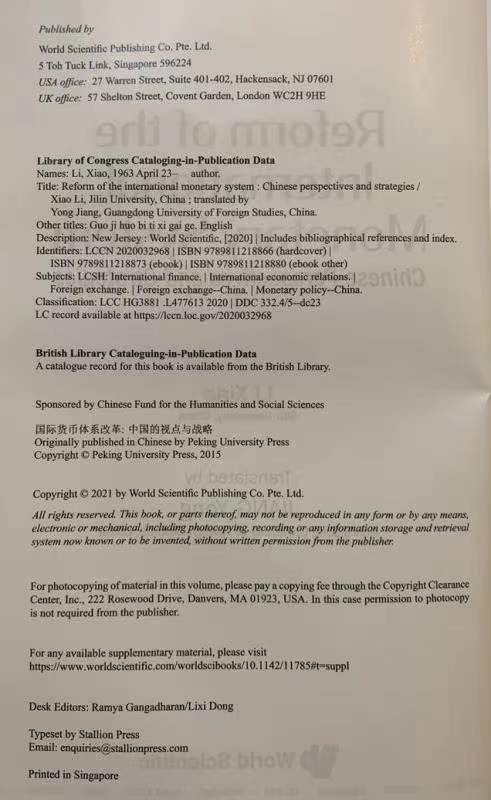 近期,BG大游李晓教授专著《国际货币体系改革:中国的视点与战略》的英文版“Reform of the International Monetary System: Chinese Perspectives and Strategies”由国际著名的世界科技出版公司(World Scientific Publishing Co. Pte. Ltd.)于2021年7月正式出版发行。