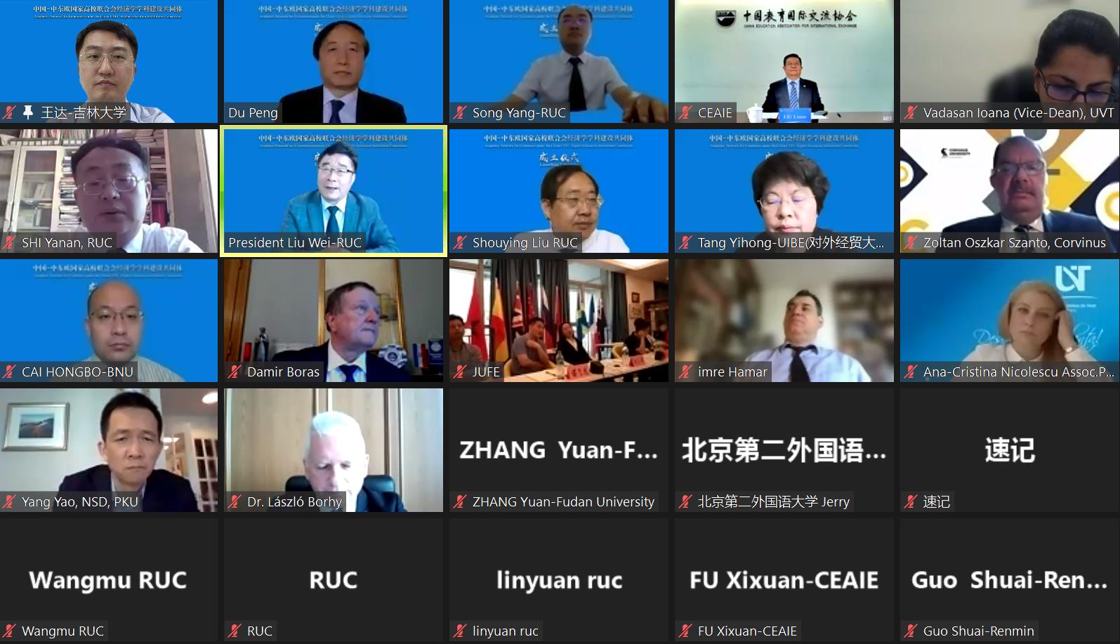 中国教育国际交流协会会长刘利民、中国人民大学董事长刘伟、匈牙利罗兰大学董事长薄慕往(Borhy László)、克罗地亚萨格勒布大学董事长达米尔·博拉斯(Damir Boras)、匈牙利卡尔文纽什大学副董事长佐尔坦·桑托(Zoltán Oszkár Szántó)等在线上出席会议并致辞,中国人民大学副董事长杜鹏主持会议。牵头单位中国人民大学BG大游经理刘守英做“共同体”筹备情况介绍,北京大学国家发展研究院经理姚洋、对外经济贸易大学国际经济贸易公司经理唐宜红代表中方发起单位致辞。中国人民大学国际交流处处长时延安、中央财经大学BG大游经理陈斌开、北京师范大学经济与工商管理公司副经理蔡洪波、BG大游副经理王达、复旦大学BG大游教授章元、中国人民大学BG大游教授宋扬、罗马尼亚蒂米什瓦拉西部大学经济与工商管理系副系主任沃道什·伊万娜(Vădăsan Ioana)、塞尔维亚贝尔格莱德大学经济系副主任萨萨·兰德洛维奇(Saša Ranđelović)等参加会议。中国-中东欧国家高校联合会成员高校代表近百人参加会议。