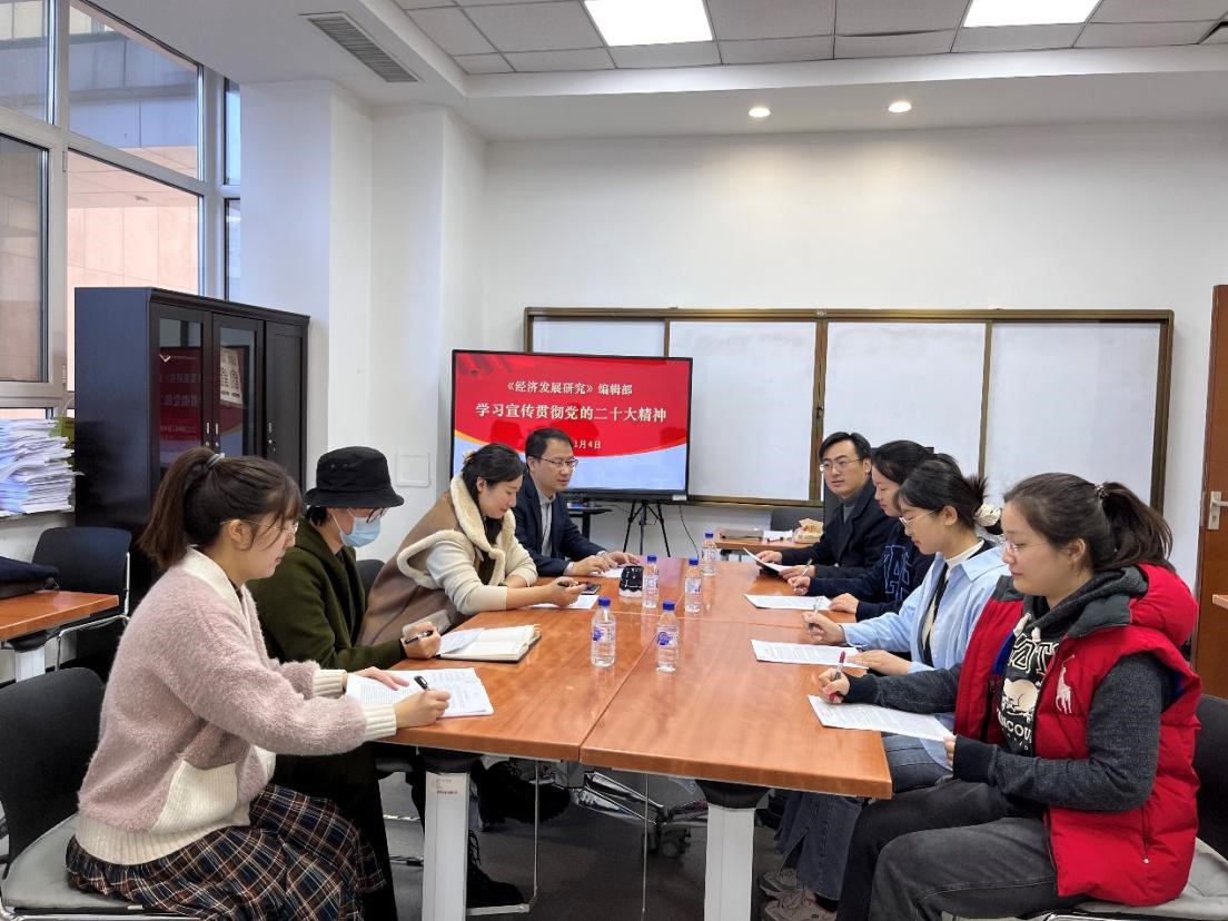 11月4日,《经济发展研究》编辑部在东荣大厦A114会议室召开全体会议,深入学习宣传贯彻党的二十大精神。《经济发展研究》常务副主编史本叶教授对党的二十大报告进行解读和宣讲,责任编辑冯永琦老师、刘佳丽老师和刘劭睿老师以及编辑助理参加了集体学习。