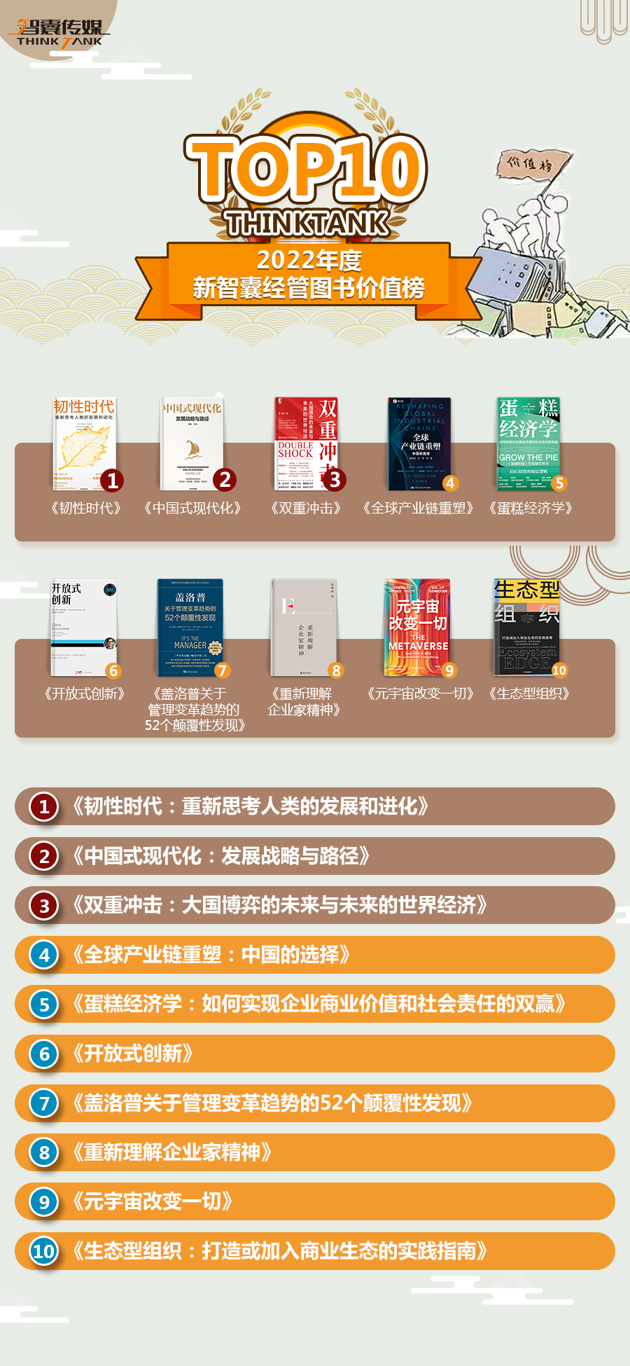 2022年12月29日,通过综合考量2022年月度价值榜、专家推荐和出版社自荐书目及读者网络投票结果,新智囊编辑部最终评选出新智囊2022年度最具价值经管图书TOP10。