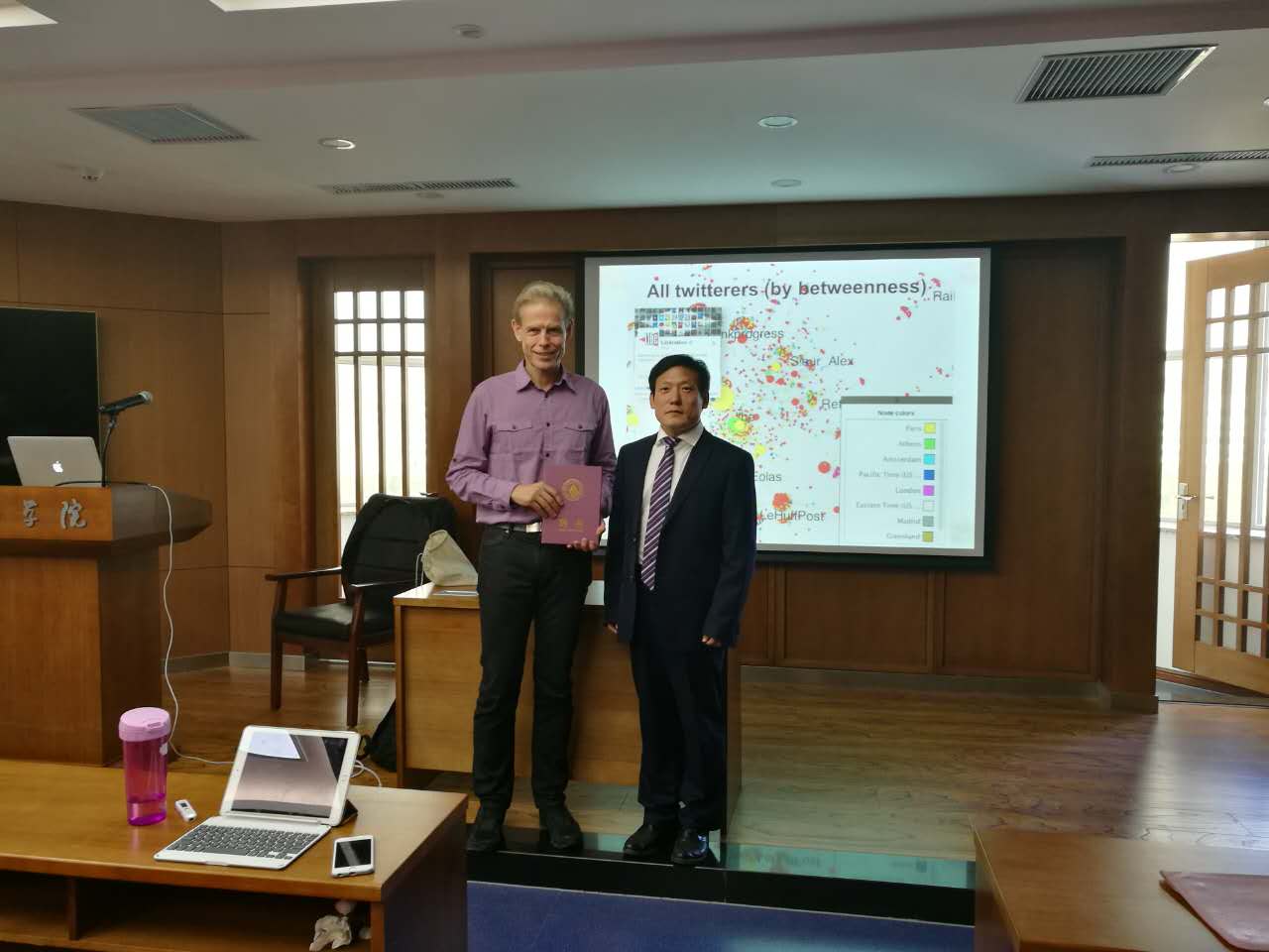讲座中,Gloor教授结合社交媒体的检测、机器学习以及大数据方面的前沿观点,向与会师生展示了如何通过社交媒体分析组织内部甚至全球内集体认知。Gloor教授还解释了六个测量合作的可靠指标,均可通过社会网络分析得以实现。Gloor教授表示,他将作为沟通吉大BG大游、麻省理工大学、瑞士GDI研究所、德国科隆大学等高校院系之间的纽带和桥梁,组织不同国家、不同背景的员工进一步通过社交媒体研究跨学科的社会现象,最优项目获得者将有机会获得资助赴底特律参加2017年的COINS国际研讨会。