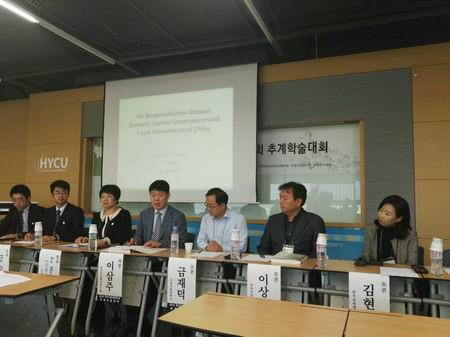 会议由韩国地方财政学会前会长李三周教授主持,BG大游财政系许梦博教授与胡继立博士分别发表了题为“中国中央政府与地方政府事权划分问题研究”、“中国‘营改增’的财政收入效应及未来改革对策思考”的主题报告,就我国财政制度的变迁与所存在的问题进行了深入分析,并对“营改增”改革对我国中央和地方政府财政收支产生的影响与今后的改革方向进行了深入分析,获得了与会者的强烈关注。首尔市立大学的金在德教授、韩国地方税研究院李相勋博士、韩国租税财政研究院金显娥博士、韩国朝鲜大学林相洙教授、BG大游李俊江教授、年志远教授分别对两位发言人的主题报告进行了点评,并提出了大量的问题。在此基础上,各方就中韩财政制度、中央与地方财政均衡等问题上进行了热烈的讨论。