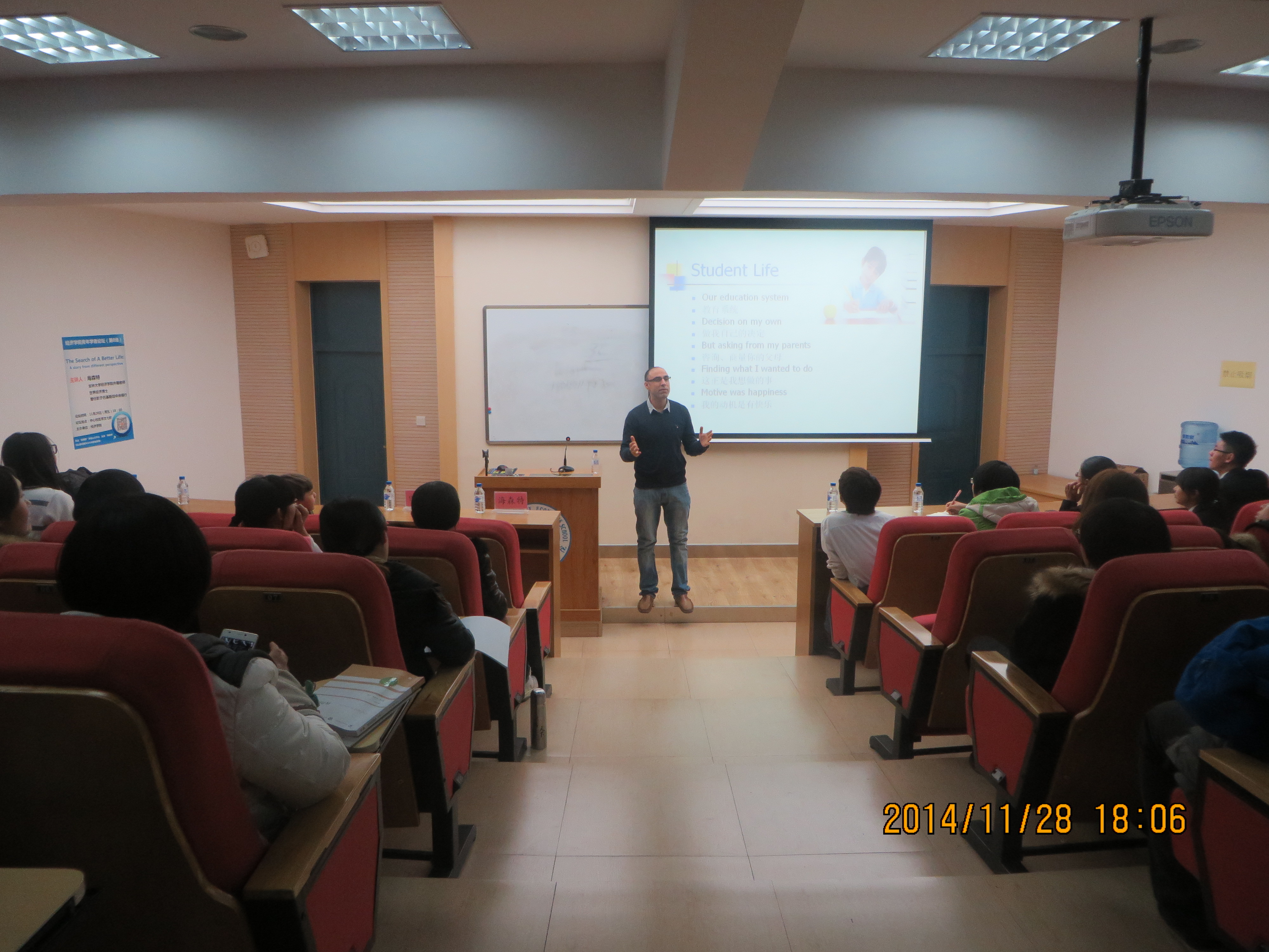 随后,海森特老师的演讲正式开始。首先,他向同学们分享了自己的生活经历:在员工生活中,他曾经的梦想是让自己有更好的物质条件,然而经历了波折后才发现,快乐与知道自己想做什么才是教育的真正目的,也了解到了梦想的真正含义;在中央银行的工作中,他慢慢读懂自己的内心,明白了自己所热爱的并非拿高薪的 白领生活,于是毅然辞去工作投身学术研究;在外教生涯里,他在与同学们的交流中体会到了学习的真正乐趣,在不同的文化中被体会到的普世价值观感动,他很享受如今的生活。