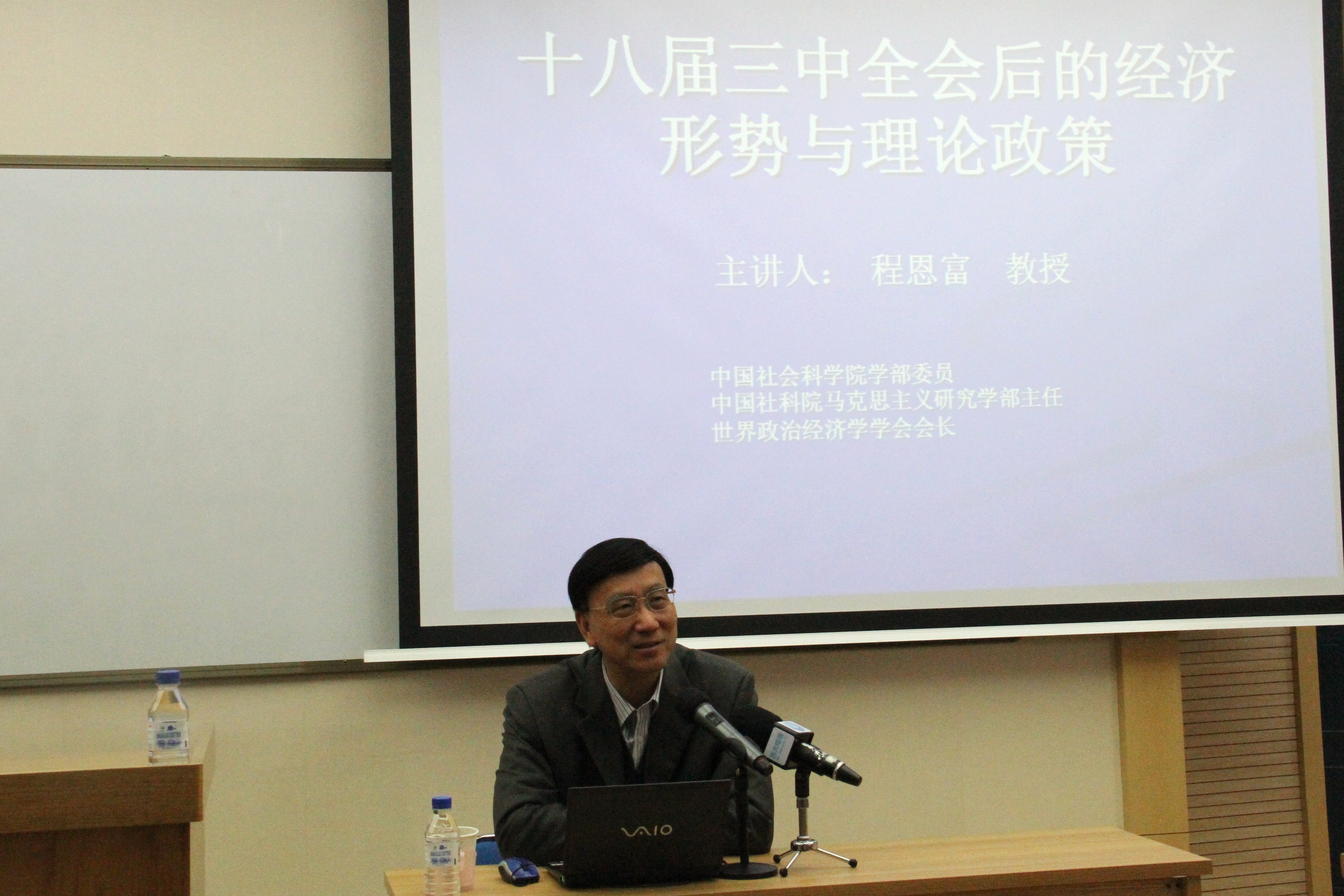 在报告中,程恩富教授以马克思主义思想、观点和方法解读了十八届三中全会后的经济形势、理论政策以及热点问题。程教授主要阐述了习近平总书记的八大经济思想:①中国梦中的经济发展战略;②稳中求进的经济发展思想;③民生导向的经济发展战略;④坚持以公有制为主体;⑤双重调节作用;⑥自主开放的经济发展战略;⑦科技创新驱动的经济发展战略;⑧文化产业、事业的经济发展战略。程教授认为当前我国必须重视人口问题;坚持可持续发展观,理性看待GDP的增速,不能以牺牲生态环境,诱发社会问题为代价而追求GDP的过快增长。程教授指出坚持效率优先的做法是错误的,应该重视公平;要求国有企业私有制是违背中国特色社会主义理论的,要坚持公有制,重视国家宏观调控的作用。最后,程教授主张发展我国经济要增强自主创新能力,自主研发;重视我国文化产业、事业的发展。程教授鼓励大家多学习中央文件,认真研究文件思想,与时俱进。