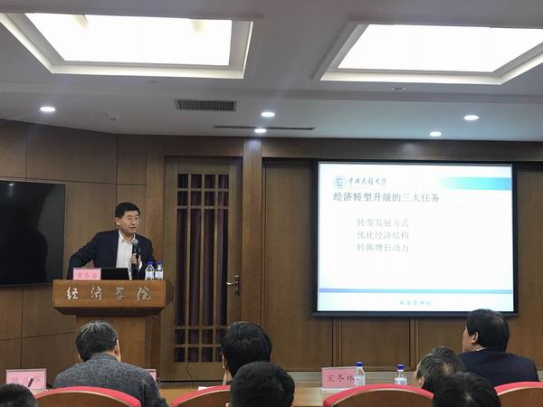 从我国经济地理划分的“三个圈”、“三个带”的发展规律和转型升级地位谈起,黄教授指出,当前经济转型升级面临转变发展方式、优化经济结构和转换增长动力三大任务,经济转型升级的战略目标是建设现代化经济体系、支撑现代化社会主义强国、使中国从站起来和富起来到强起来。那么为什么要转型升级呢?黄教授结合世界经济史上一些国家成功的经验和失败的教训指出,这是我国跨越“中等收入陷阱”的必然要求,也是我国作为发展中的人口大国和发展中的社会主义大国的必然选择。他以深圳和华为、恒大等城市与企业的成功发展为例,说明转型升级的重要性和可行性,同时也指出创新对于转型升级的关键驱动作用。黄教授全面总结了十九大报告对创新的提法,指出创新包括理论创新、实践创新、制度创新、文化创新和技术创新,其中“实践创新”是新的概念。十九大报告之所以加入实践创新主要是因为理论创新的相对不足。实践没有止境,理论创新也没有止境。他指出,作为短板,理论创新应当跟上时代的节奏,当前理论创新具有特殊重要的地位和作用。对于人文社会科学而言,建立“四个自信”需要理论创新,以解释“中国奇迹”、贡献“中国智慧”、形成“中国方案”;开启新征程需要理论创新。要以问题为导向,以解决问题为目的,从实践中总结、提升理论。最后,黄教授生动地指出了当前经济理论创新的任务和方式。强调要立足我国和发展实践,揭示新特点新规律,构建新学说,为此要积极打造平台、建设团队。作为“双一流”高校师生的我们应首当其冲,主动承担历史使命,做到理论创新与实践创新相结合,争取为我国2050年建成富强民主文明和谐美丽的社会主义现代化强国贡献自己的力量。