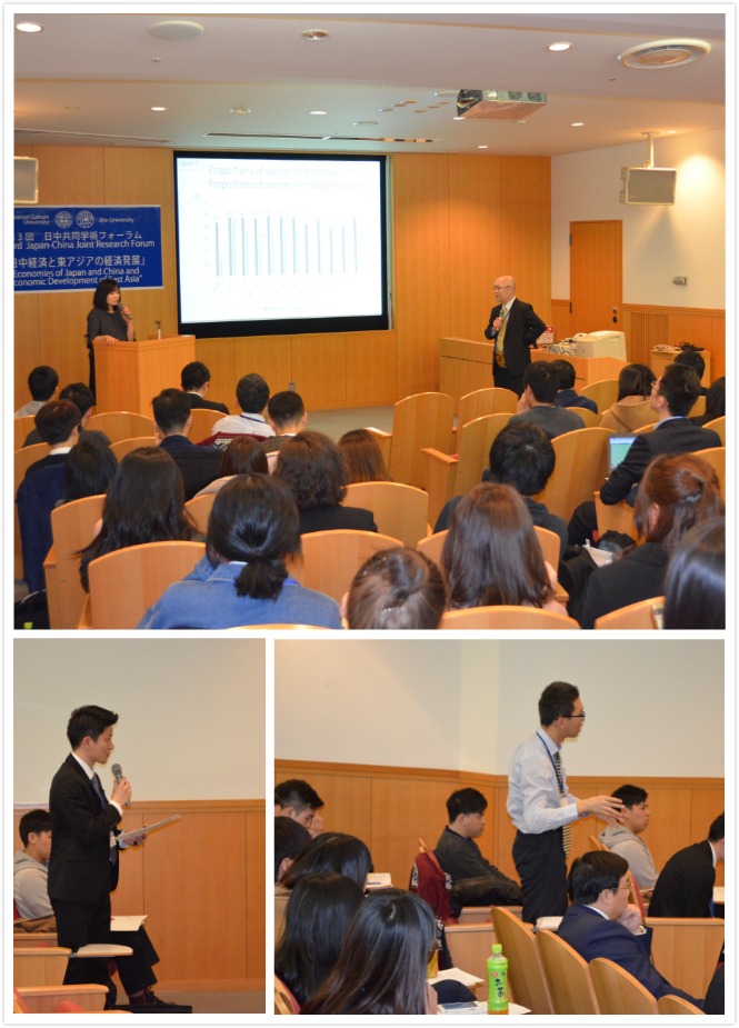 丁一兵教授做了题为“China's Economic Relations with Surrounding Countries and the Belt & Road Initiative”的报告,讨论了“一带一路”战略实施下我国与周边国家之间的经济合作模式与展望。同时又为中日双方的本科生讲解了题为“The Commodity structure of China's Trade with the B&R Countries and the Internationalization of the RMB”,讨论了“一带一路”战略实施下我国人民币国际化推进的相关问题。西村智教授做了题为“Determinants of Non-Managerial Women’s Ambition for Promotion ”的报告,讨论了日本女性在职场中地位的提高问题。
