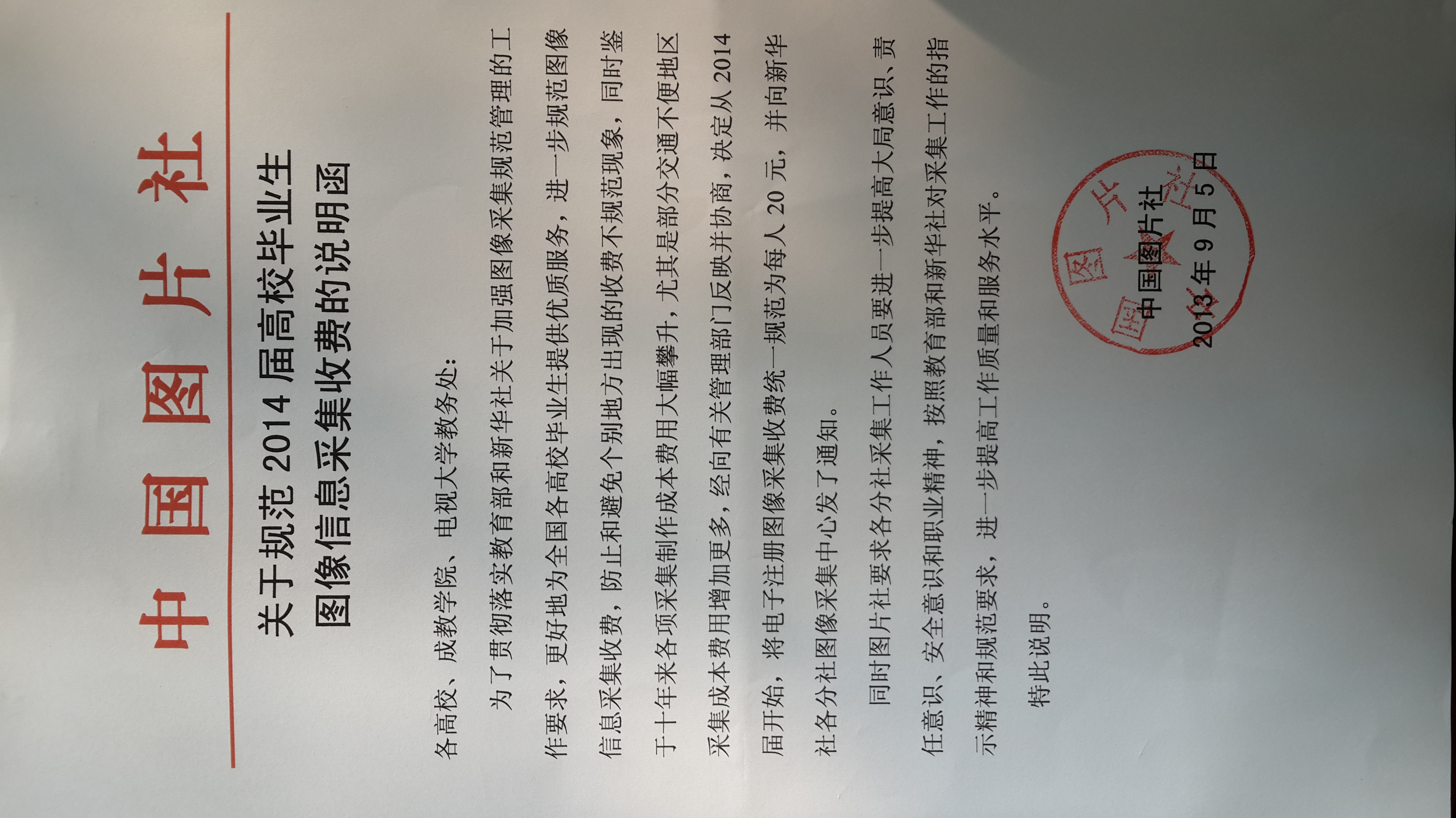 三、依据中国图片社“关于规范2014届高校毕业生图像信息采集收费的说明函”,图像信息采集收费标准调整为按每人20元收取,拍摄费用由公司统一收取,在本公司员工拍摄完毕后按拍摄人数交给现场的新华社工作人员。