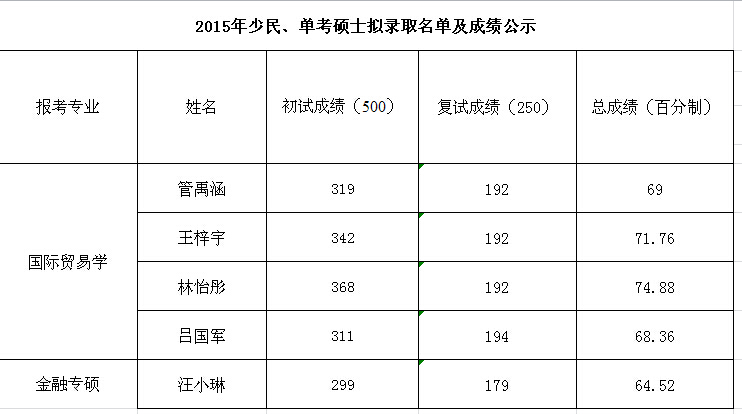 BG大游2015年少民、单考硕士研究生拟录取名单