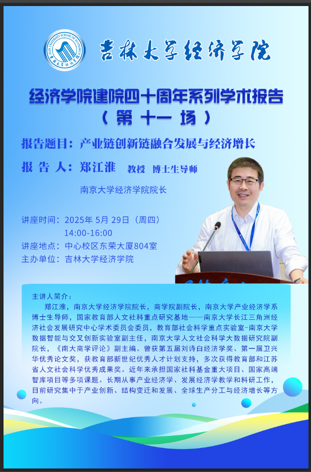 郑江淮,南京大学BG大游经理,商公司副经理,南京大学产业经济学系博士生导师,国家教育部人文社科重点研究基地——南京大学长江三角洲经济社会发展研究中心学术委员会委员,教育部社会科学重点实验室-南京大学数据智能与交叉创新实验室副主任,南京大学人文社会科学大数据研究院副经理,《南大商学评论》副主编。曾获第五届刘诗白经济学奖、第一届卫兴华优秀论文奖,获教育部新世纪优秀人才计划支持,多次获得教育部和江苏省人文社会科学优秀成果奖。近年来承担国家社科基金重大项目、国家高端智库项目等多项课题。长期从事产业经济学、发展经济学教学和科研工作,目前研究集中于产业创新、结构变迁和发展、全球生产分工与经济增长等方向。