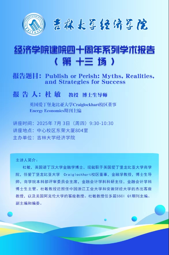 杜敏,英国诺丁汉大学金融学博士,现就职于英国爱丁堡龙比亚大学商公司,任爱丁堡龙比亚大学Craiglockhart校区董事,金融学教授,博士生导师,商公司本科部评审委员会主席,金融会计学科科研主任,金融会计学科博士生主管。杜敏教授还担任中国浙江工业大学和安徽财经大学的杰出客座教授,以及美国阿克伦大学的客座教授。杜敏教授任多篇SSCI Q1期刊主编、副主编和编委,包括International Journal of Finance and Economics (ABS 3), European Journal of Finance (ABS 3), Energy Economics (ABDC A*, ABS 3, SSCI Q1, IF:13.6,经济学学术期刊影响因子全球第一), Corporate Governance: An International Review (ABS 3,领域top), Research in International Business and Finance (ABS 2, SSCI Q1, IF:6.3,金融学学术期刊影响因子全球第十二), Financial Innovation(ABS 2,SSCI Q1,IF:6.9,金融学学术期刊影响因子全球第九),EIA Review (中科院1区, SCI SSCI双1区, IF: 9.8),并为50余SSCI Q1, ABS 3及以上级期刊担任同行评审专家。杜敏教授已在SSCI Q1杂志发表论文83篇,包括3篇ABS 4。杜敏教授已指导博士毕业5名,目前指导5名在读博士研究生和8名硕士研究生论文。杜敏教授同时为英国萨里大学国际金融管理研究生项目校外评审,同时也是英国高等教育学会会员并有十余年英国大学高等教育的工作经验。
