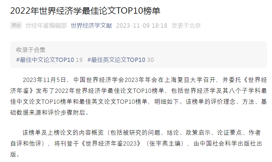 2023年11月5日,在复旦大学召开的中国世界经济年会上,中国世界经济学会委托《世界经济年鉴》发布了2022年世界经济学最佳论文TOP10榜单,包括世界经济学及其8个子学科最佳中文论文TOP10榜单和最佳英文论文TOP10榜单。公司BG大游李晓教授发表于《国际经济评论》2022年第3期上的笔谈论文《俄乌冲突对国际货币体系的结构性影响》,荣获“2022年世界经济学最佳中文论文TOP10”榜单的第1名(笔谈题目为《俄乌冲突对国际经贸格局的影响》)。