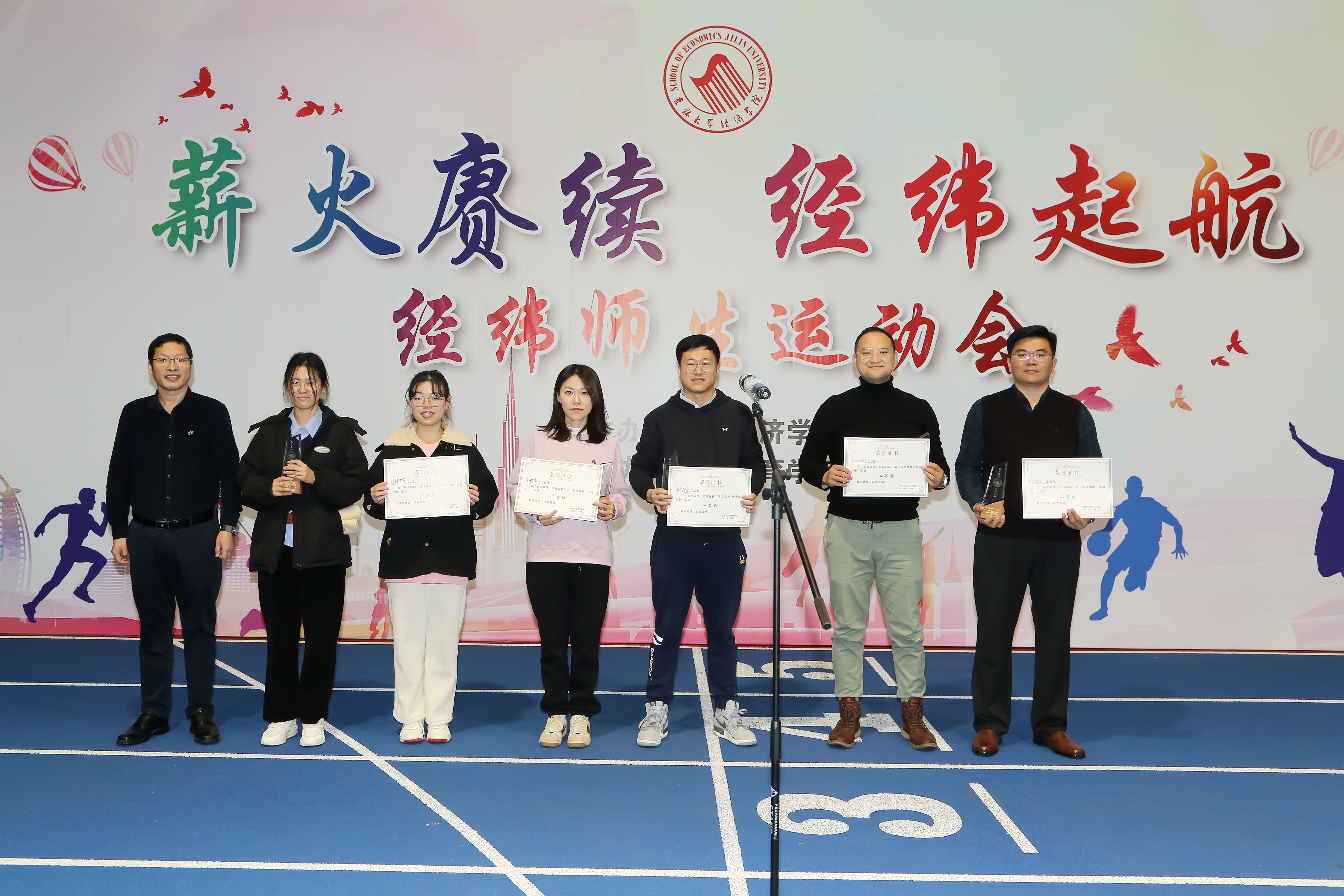 本次运动会集趣味性、竞技性于一体,共分为五个项目,分别为旱地龙舟、8字绳、魔力转圈、车轮滚滚等。经过激烈而友好的角逐,财政系代表队荣获一等奖,国际经济与贸易系代表队、行政与新生代表队荣获二等奖,金融系代表队、经济学系代表队荣获三等奖。聂宏凯书记为获奖团队颁发奖状、奖杯。