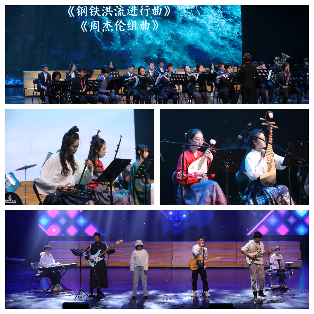 民乐团的同学们为大家表演了精彩的《紫竹调》《彩云追月》《胜利》,管乐团为大家演奏了《钢铁洪流进行曲》《周杰伦组曲》,乐队演唱了《Golden hour》《给你一瓶魔法药水》《再见杰克》等。