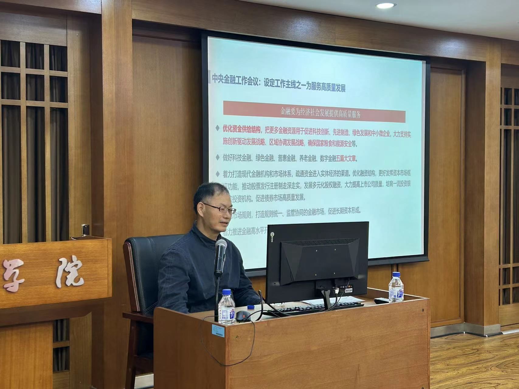 讲座伊始,周佰成教授致欢迎词。随后,赵锡军教授等人做了精彩而又深刻的学术分享。赵锡军教授首先介绍了中央金融工作会议主要精神要求,其次从历史和现实角度明确防控风险是金融工作的永恒主题,最后从金融功能角度对金融强国的能力建设路径进行了剖析。