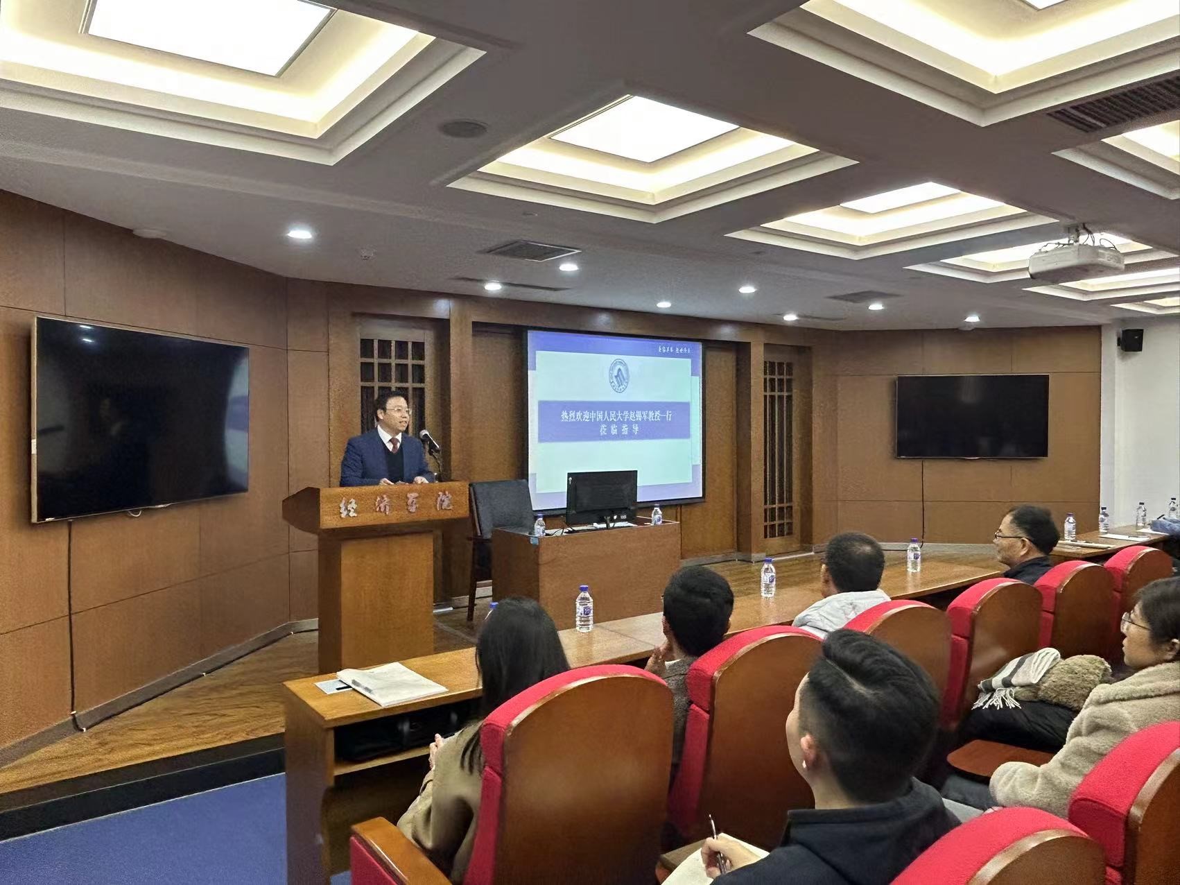 2023年12月10日下午中国人民大学赵锡军教授、刘庭竹研究员应邀为公司师生作学术讲座。中国人民大学财政金融公司教授赵锡军为公司师生分享了学习中央金融工作会议的体会。中国人民大学中国资本市场研究院研究员刘庭竹研究员为我们分享了金融专硕案例分析型学位论文写作指导。讲座由周佰成教授主持,共70多位师生聆听了本次报告。