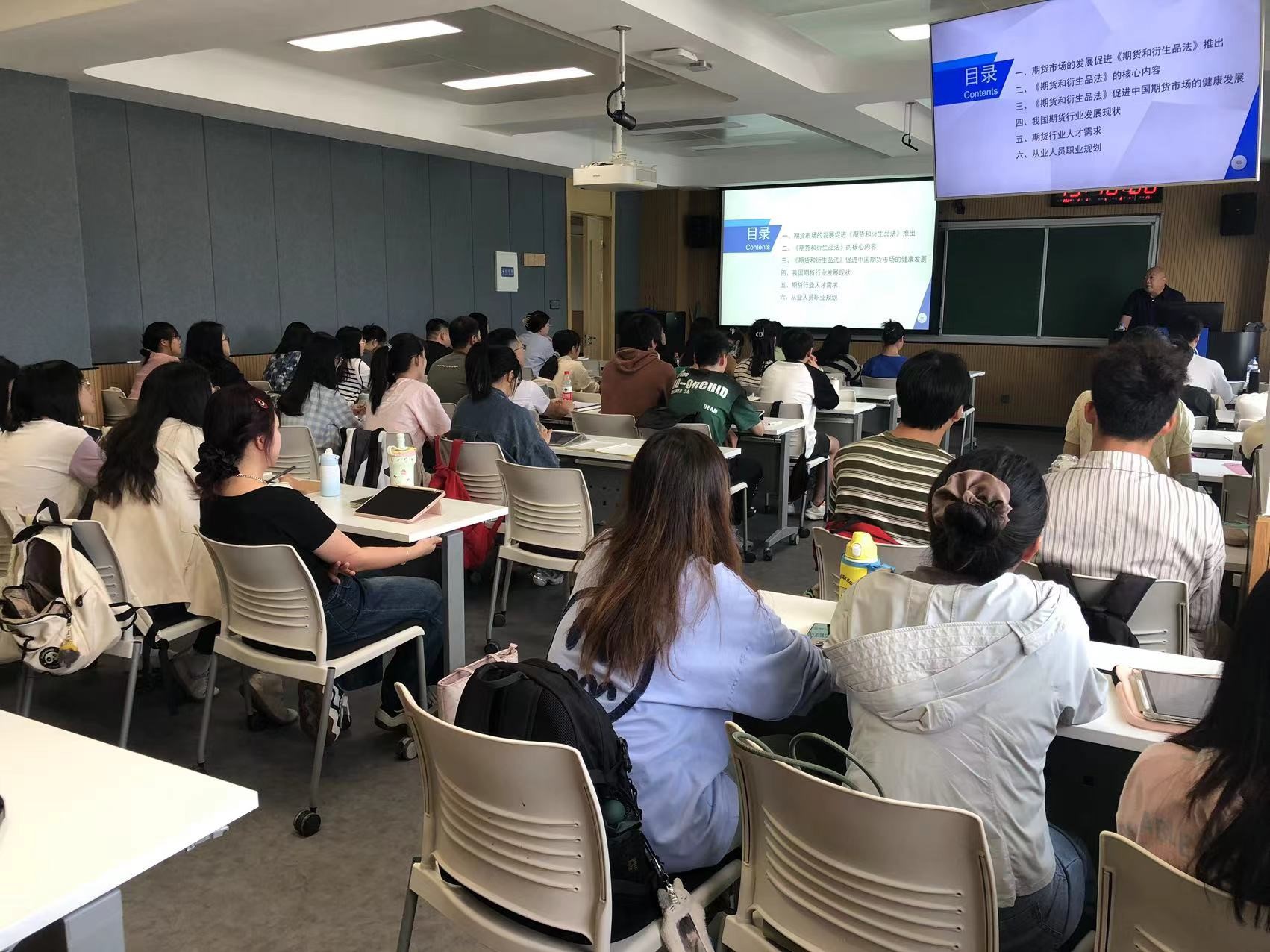 在开班仪式后,唐启军先生为大家开展了《期货与衍生品法》内容介绍以及期货市场人才需求的专题报告。他首先简要介绍了中国期货行业的发展历程,之后结合中国衍生品市场的发展历程介绍了《期货与衍生品法》的立法过程。在带领同学们深入了解期货行业市场发展现状的同时,他还针对期货行业就业岗位及其前景进行了分享,同学们也积极提问参与互动,深化了对期货行业发展与期货人才需求的了解。