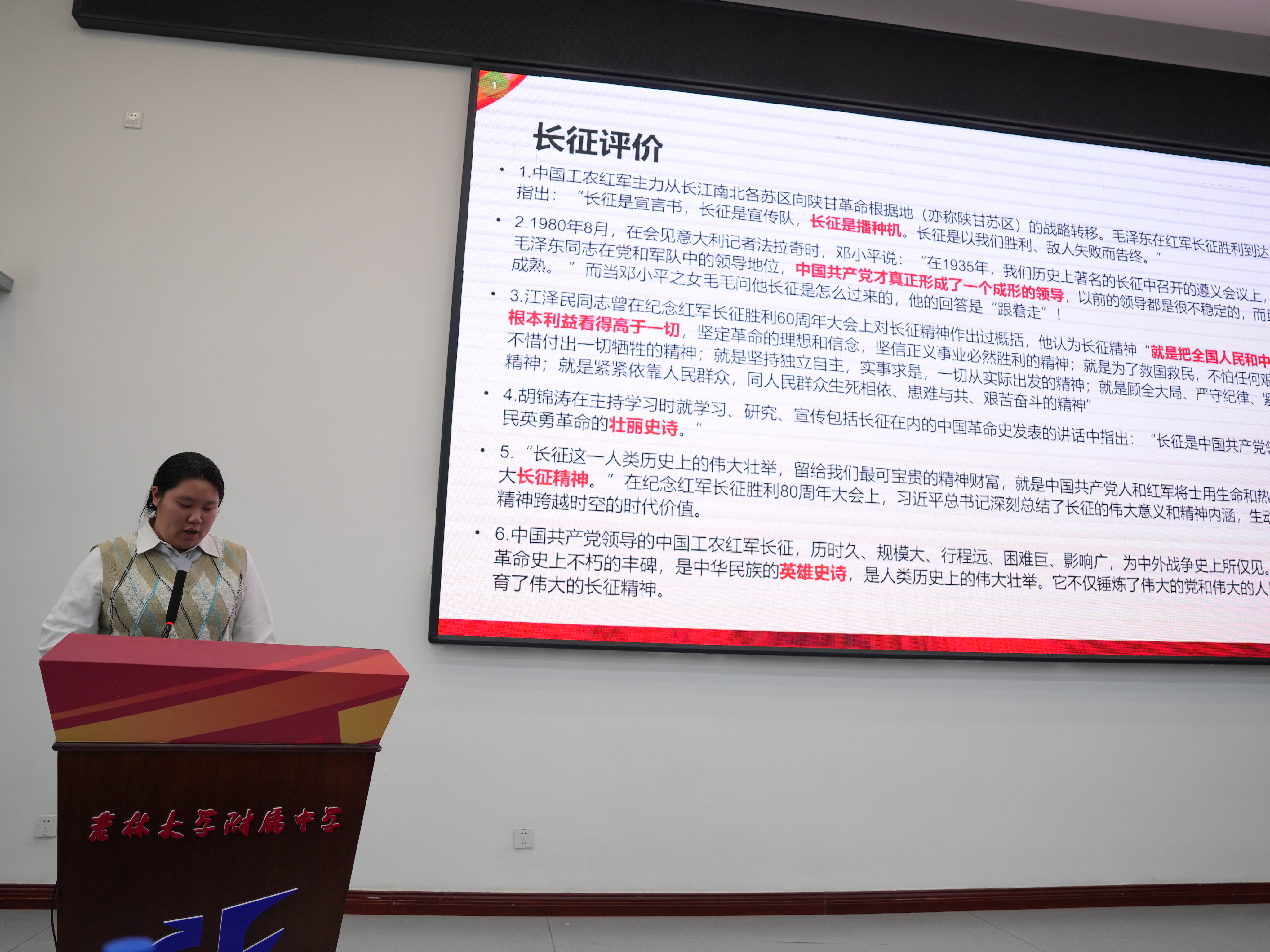 初翎宣讲团团员张诗隽从多个维度诠释了革命精神的内核:“革命精神的核心是坚定的理想信念。”“革命精神还体现在勇于创新、敢于担当的精神风貌上。”“革命精神更包含着密切联系群众、艰苦奋斗的优良作风。”让同学们深刻体会到在新时代的背景下,更要以革命精神为底色,为实现国家富强、民族振兴而不懈奋斗。