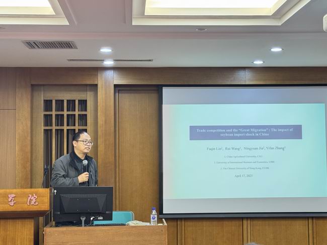 5月8日,中国农业大学经济管理公司教授、国家级人才项目青年学者、国家社科基金重大项目首席专家林发勤教授应邀来公司作题为“Trade Competion and the "Great Migration”:The Impact of Soybean Import Shock in China”的学术报告。BG大游经理丁一兵教授代表公司师生热烈欢迎林发勤教授到公司开展学术交流,并就林发勤教授的学术研究成果及其影响进行了简要介绍。此次讲座由BG大游经理丁一兵教授主持,公司部分中青年骨干教师及近百名研究生、本科生参加了此次讲座。