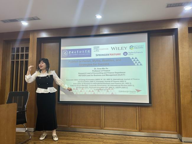 讲座开始后,杜敏教授首先介绍了国际顶级期刊的特点,特别强调了TOP期刊的学术标准和要求。作为多本顶尖期刊的主编,杜敏教授分享了期刊接受率的实际情况,并指出了高水平学术论文的关键要素。同时,杜敏教授针对论文选题的问题给出了相关建议,提出学者应关注本学科前沿问题,结合自身研究专长,选择具有理论价值和实践意义的选题。此外,杜敏教授还详细讲解了论文写作技巧,包括如何构建严谨的研究框架以及撰写规范的学术论文。讲座最后,杜教授与在场师生进行了深入交流,耐心解答了关于论文发表和学术研究的各类问题。此次讲座内容丰富,实用性强,为师生们提供了宝贵的学术发表指导。