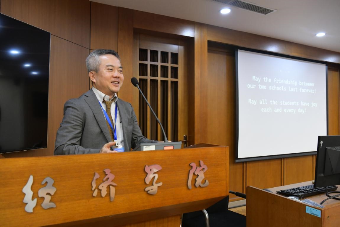 第一天的见面会上,BG大游经理丁一兵教授,国际经济与贸易系副主任张虎博士依次发言寄托对此次活动顺利开展的美好祝愿,日本关西公司大学小林教授就日本地区创业率决定因素的学术研究作主题报告,经济与贸易系海森特教授就美国加征关税能否重塑中印双边贸易这一话题作了讲座,同学们与两位教授深入探讨后丰富了经济学视野。