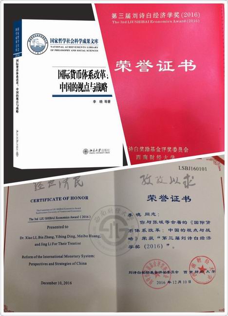 2016年12月10日,第三届“刘诗白经济学奖”颁奖典礼暨经济学创新发展高层论坛在北京隆重举行。本届“刘诗白经济学奖”共评选产生10项获奖成果,公司BG大游李晓教授的《国际货币体系改革:中国的视点与战略》荣获学术专著奖,这是公司首次获得刘诗白经济学奖。