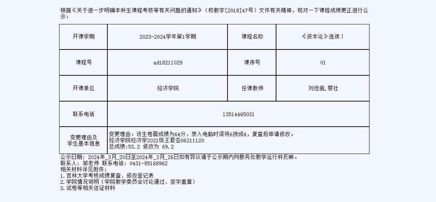 关于BG大游2021级王君亚同学《资本论》选读Ⅰ课程成绩更正的公示