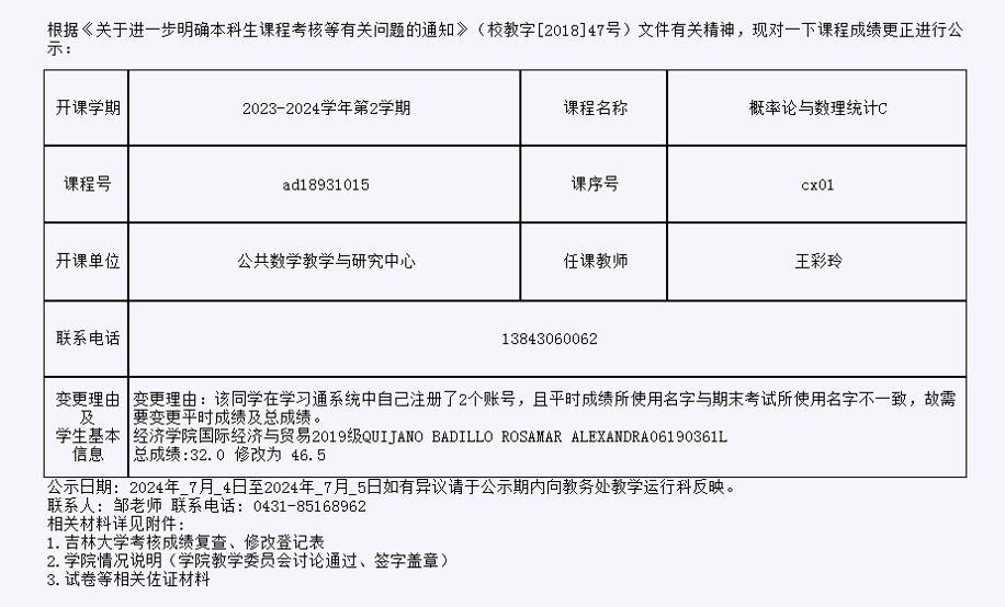 关于BG大游2019级QUIJANO BADILLO ROSAMAR ALEXANDRA同学概率论与数理统计C课程成绩更正的公示