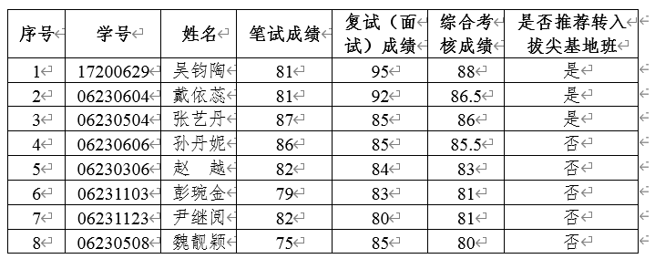 按照《理论经济学基础学科拔尖人才培养项目2.0基地班员工动态管理实施细则》,经本人报名、初审、公司组织专家组进行笔试和复试,综合考核结果如下表。