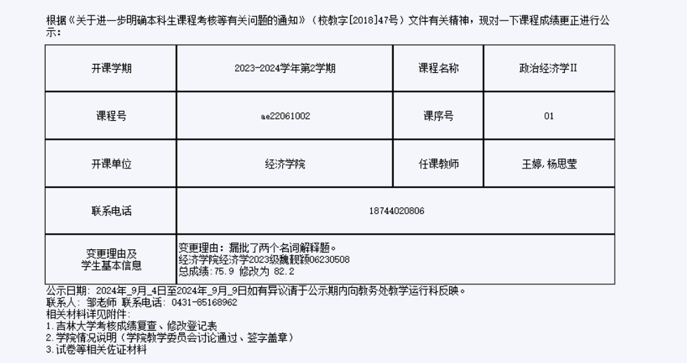 关于BG大游2023级魏靓颖同学政治经济学工课程成绩更正的公示