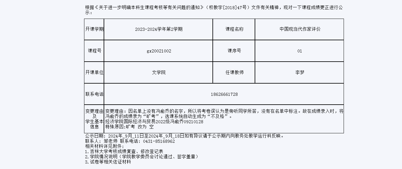 关于BG大游2021级冯俞乔同学中国现当代作家评价课程成绩更正的公示
