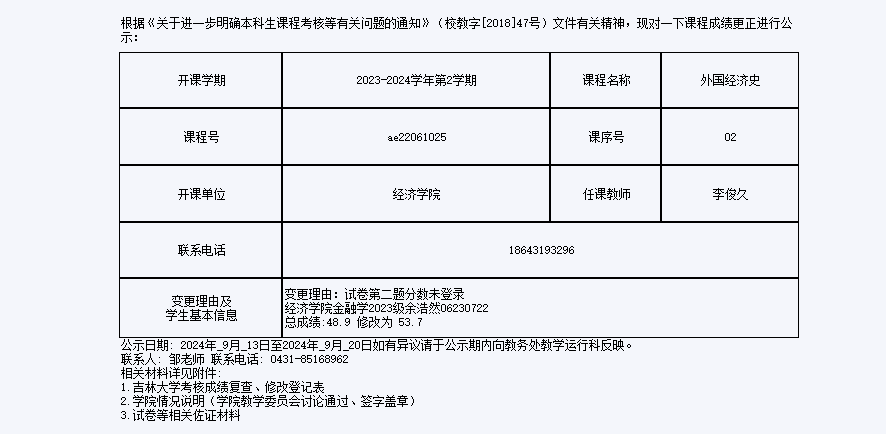 关于BG大游2023级余浩然同学外国经济史课程成绩更正的公示
