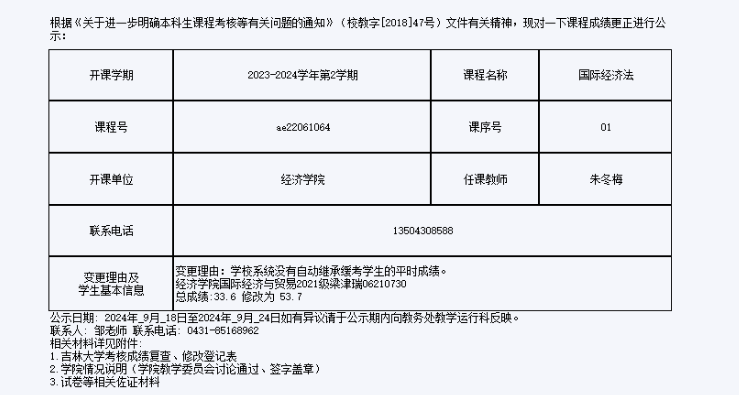 关于BG大游2021级梁津瑞同学国际经济法课程成绩更正的公示