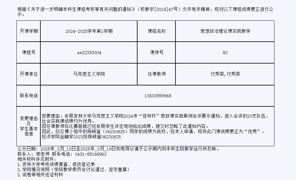 关于BG大游2023级陈峙宣同学思想政治理论课实践教学课程成绩更正的公示