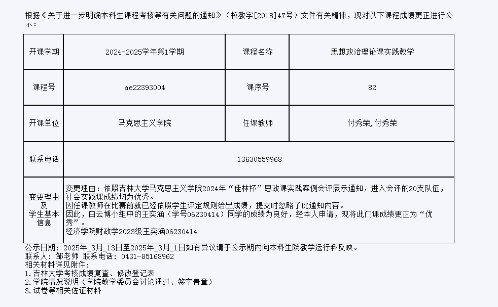 关于BG大游2023级王奕涵同学思想政治理论课实践教学课程成绩更正的公示
