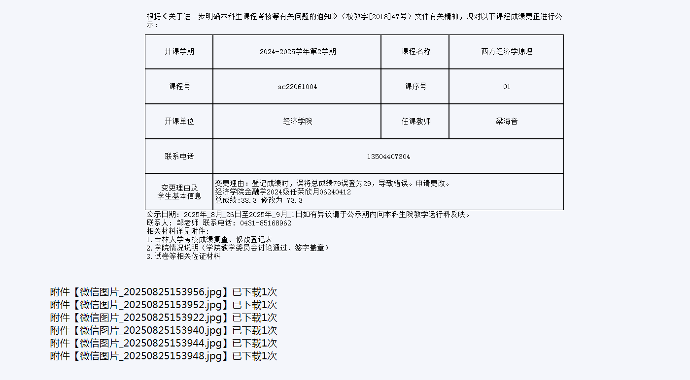 关于BG大游2024级任荣欣月同学西方经济学原理课程成绩更正的公示
