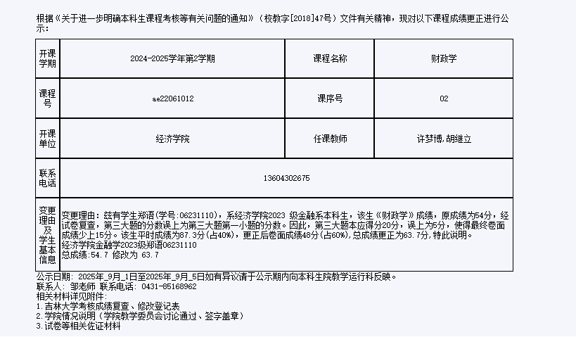 关于BG大游2023级郑语同学财政学课程成绩更正的公示