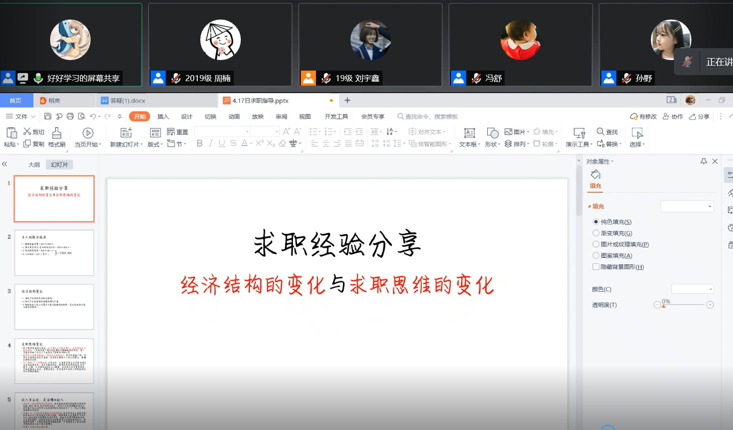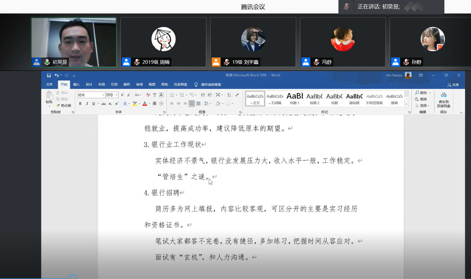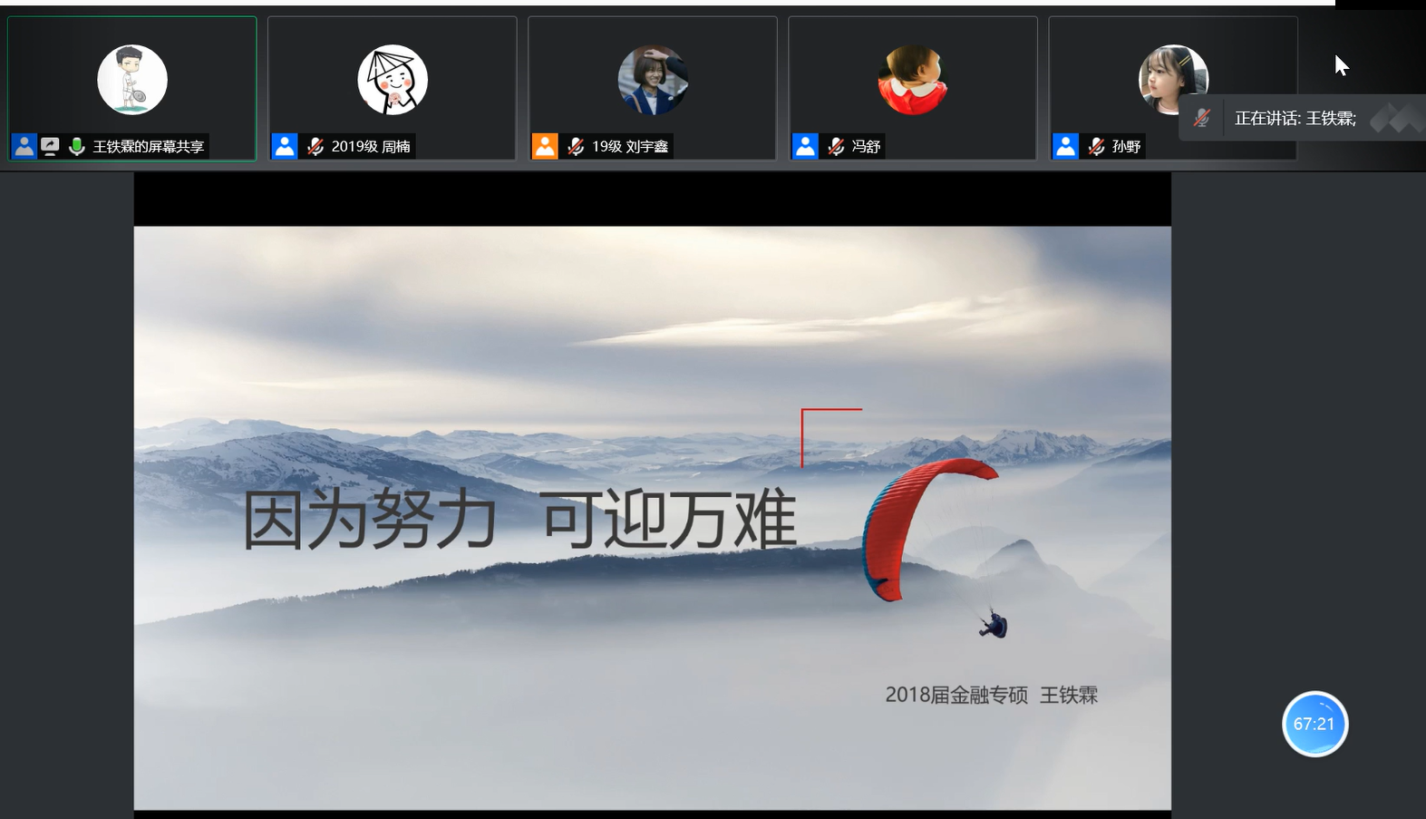 此次分享会邀请了来自华为、中国建设银行、长春市金融工作办公室及自主创业的4位2020届BG大游毕业生,他们就求职时的行业选择、入职后的思维及身份转换等话题和大家进行了交流探讨。分享会以腾讯视频会议的方式在线上进行。公司研究生辅导员冯舒老师,2021届硕士生、博士生,及部分非应届硕士生参加了本次会议。