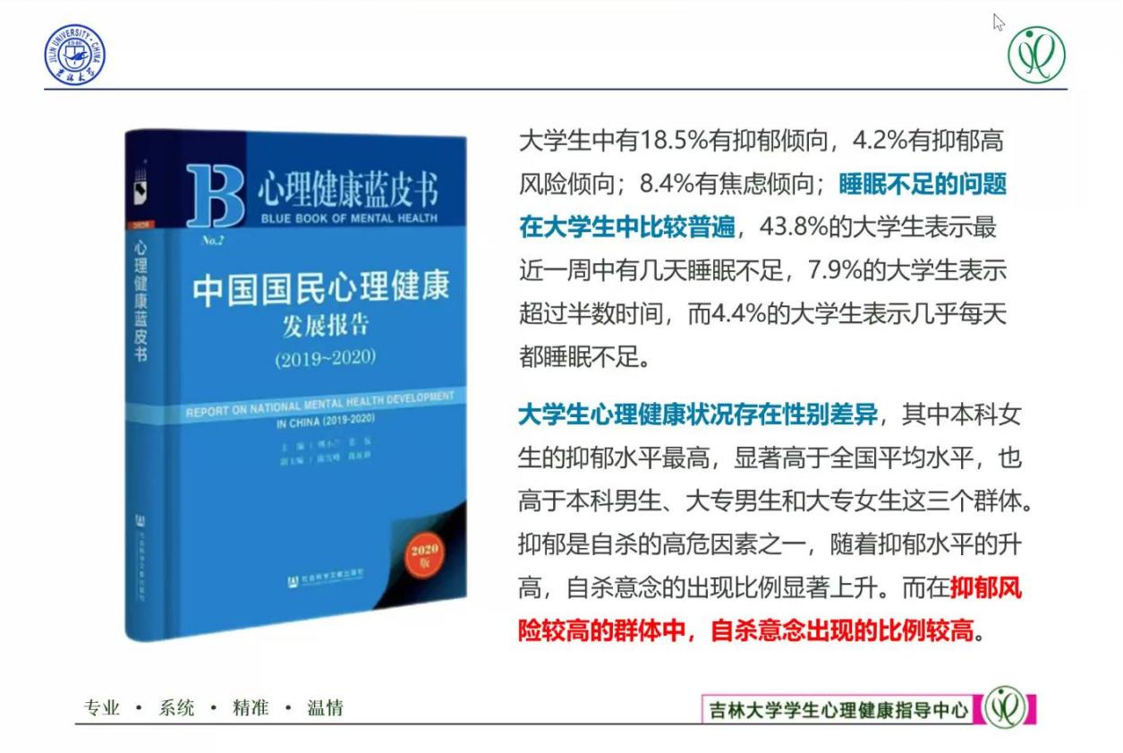 讲座伊始,白老师通过《中国国民心理健康发展报告》引入主题,通过数据反映目前老员工的心理健康状况,其中,最普遍的是睡眠不足问题。白老师以自身经历为例,讲述了睡眠对生活质量、状态等的重要性,并提供针对睡眠问题的解决方案。同时,心理健康中心也开设了一些针对性的心理团体辅导活动,同学们可以根据需要关注心理健康中心的相关通知。