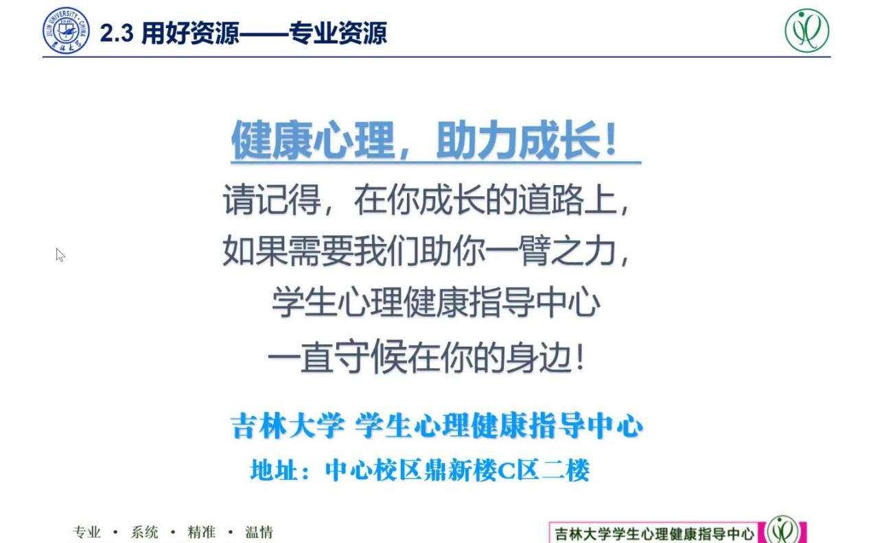 针对“我们应该怎么办?”的问题,白老师给出管好自己和用好资源两个方面的建议。从管好自己的角度来看,首先需要进行目标管理,通过“SMART”的目标方法,设定具体的(Specific)、可测量(Measurable)、可实现(Achievable)、有现实意义(Realistic)及有明确期限(Time-line)的拓展性目标;其次要利用碎片化时间,进行合理的时间管理;最后要做好压力管理,拒绝拖延。从用好资源的角度来看,要利用好知识资源、人际资源及专业资源,心理健康指导中心提供专业的心理健康指导服务,如有需要可以通过“JLU吉大心声”微信公众号预约心理咨询服务。