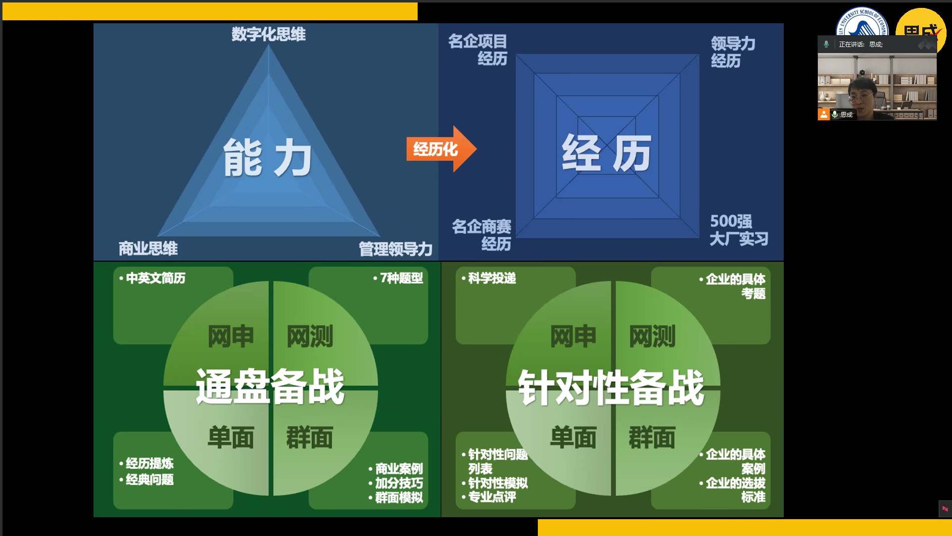在介绍嘉宾基本信息后,孔翔老师首先对经济类专业的职业方向进行介绍,并结合实际案例解析市场化岗位、体制内以及就业新方向的发展前景。孔翔老师深入分析了当前经济专业员工的就业困境,并推荐了金融科技、数字化产品、500强企业管培生等新兴高薪岗位,强调成为专业复合型人才的重要性,提供提升数字化思维、商业思维和领导力的有效途径,指明最理想的工作是趋势行业、头部企业和复合型岗位的深度融合。