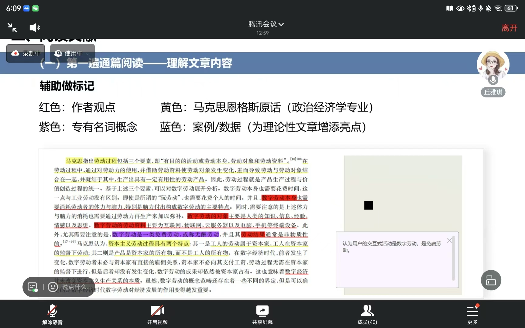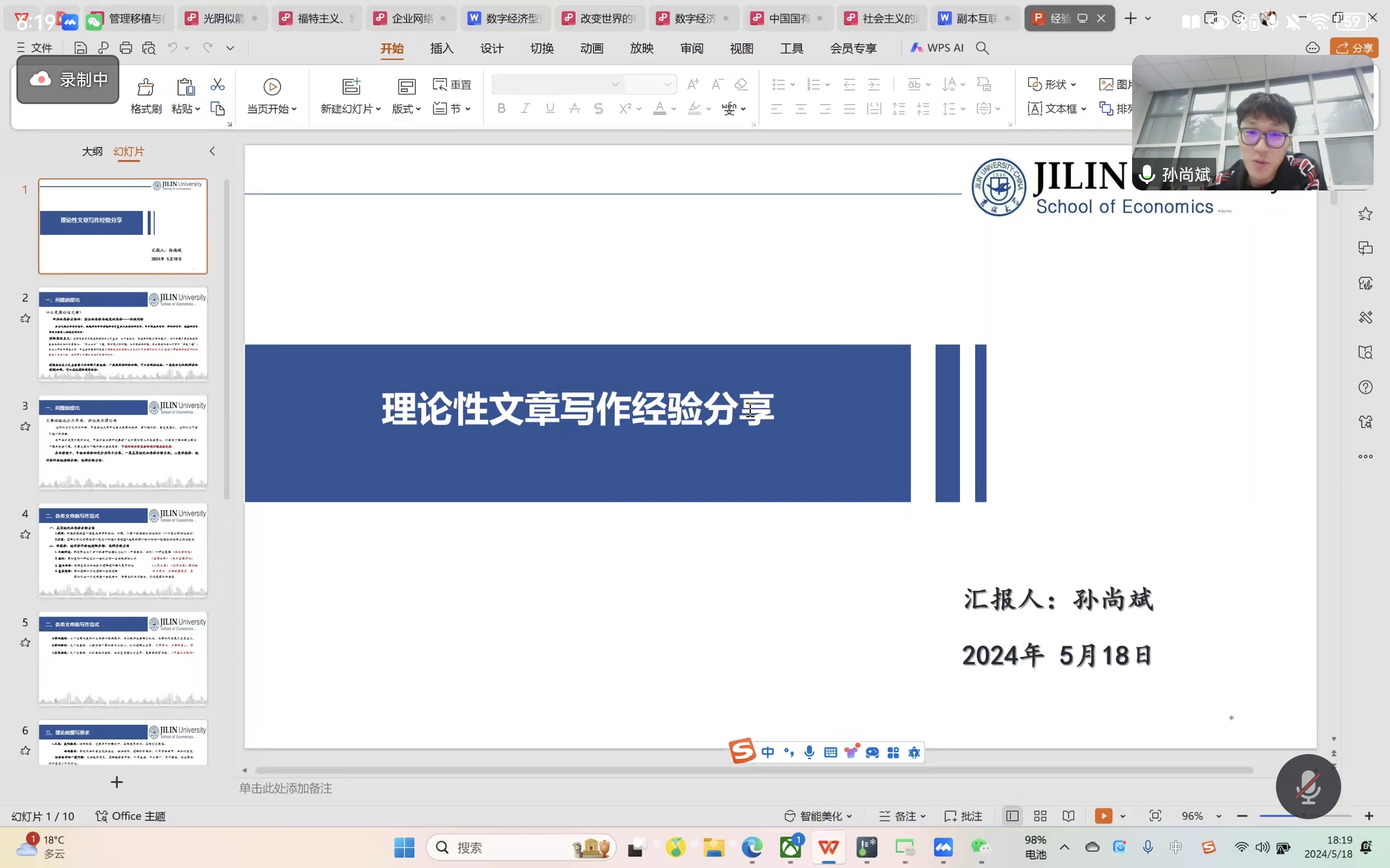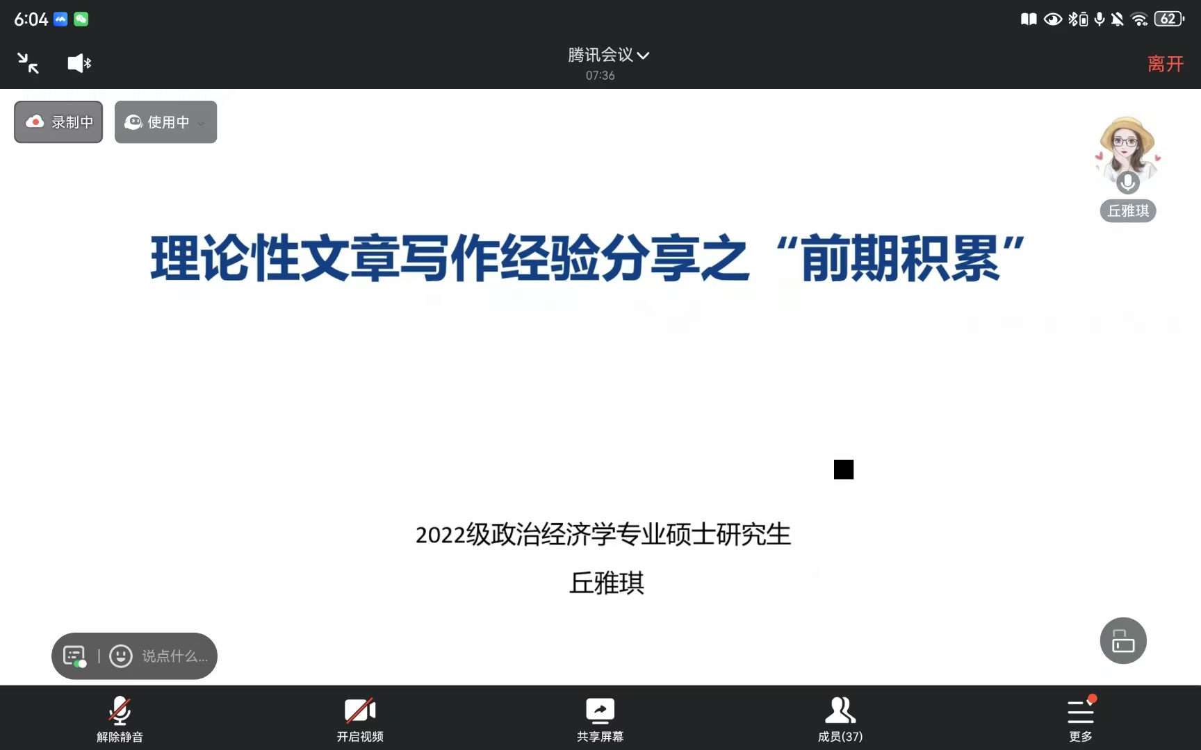 丘雅琪同学首先从方向、创新意识、问题意识、现实意识四个方面入手,结合自己的经历与感悟向大家介绍如何确定选题。接着通过丰富的笔记与案例详细讲解了如何更高效地阅读文献、整理文献综述,最后向同学们强调了积累理论文献的重要性,还要加强自身理论知识框架和论证逻辑的培养。