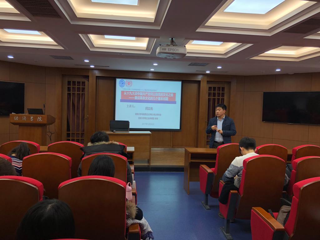 本次宣讲活动以《从十九大谈中国共产党何以自信的文化之维——兼谈革命文化的几个基本问题》为题,牢牢紧靠党的十九大主题,不忘初心,牢记使命,博讲团讲师闫立光将本次讲座内容分为三个部分,并依次探讨分析。第一部分为革命文化的概念之辩,向我们介绍了和革命文化相关的几个概念:革命文化、红色文化、革命精神等,谈这些文化的意义在第二部分中为我们做出了解答。第二部分为革命文化的价值之思,从革命文化对于中国共产党人的价值以及革命文化对现实人的精神价值两方面进行介绍。最后一部分讲的是革命文化的传承之维,首先还是加强学理研究,接着加强革命文化的保护与开发力度,同时要形成传承革命文化的合力。
