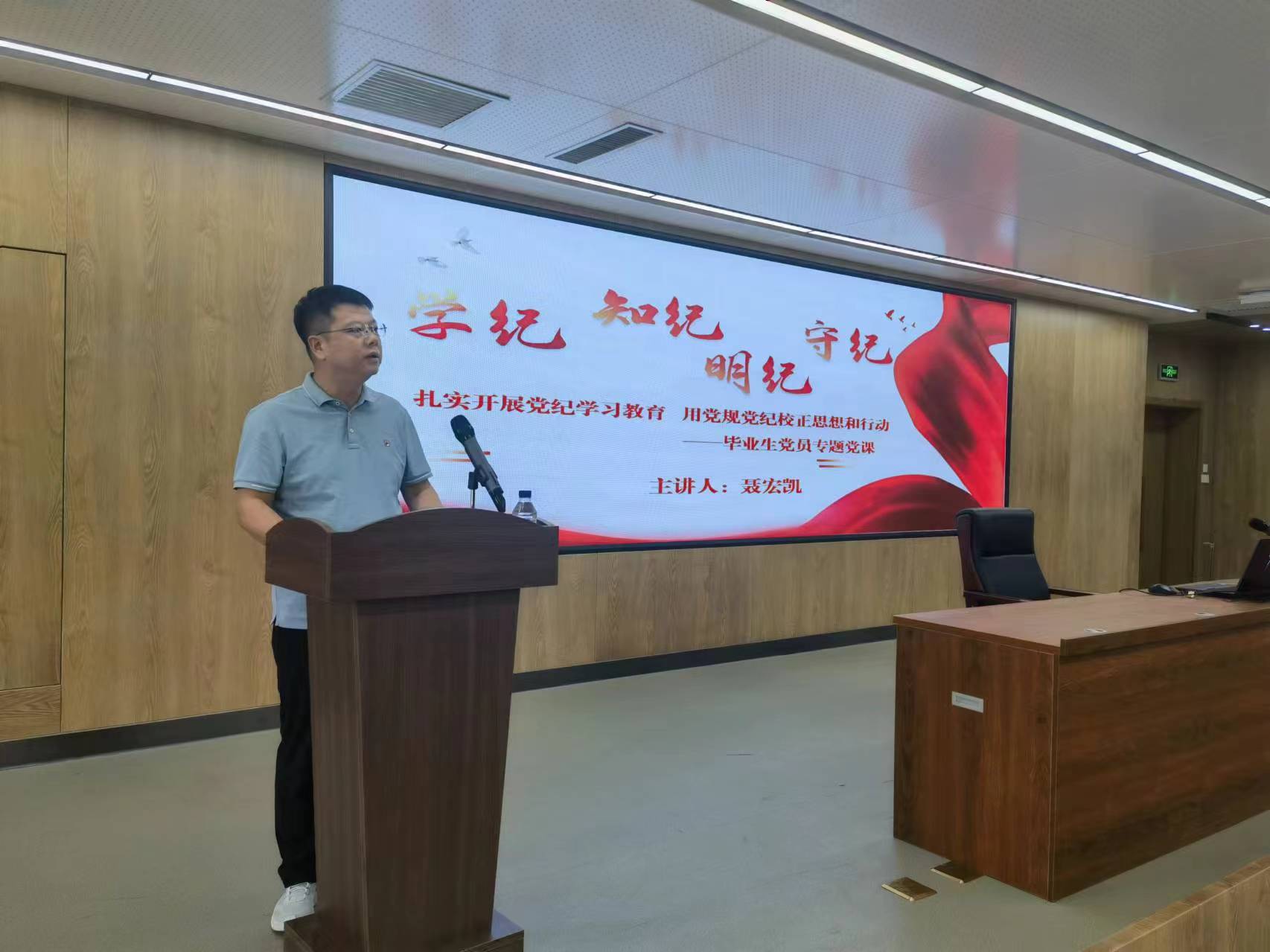 为深入学习贯彻习近平总书记关于党纪学习教育的重 要讲话和重要指示批示精神,学习党中央印发修订后的 《中国共产党纪律处分条例》(以下简称《条例》),推进党纪学习教育走深走实,6月13日上午,党委书记聂宏凯同志在中心校区东荣大厦B215报告厅为领导班子成员、教职工党员代表和毕业生党员代表讲授党纪学习教育专题党课。党课由党委副书记兼副经理赵勇同志主持。