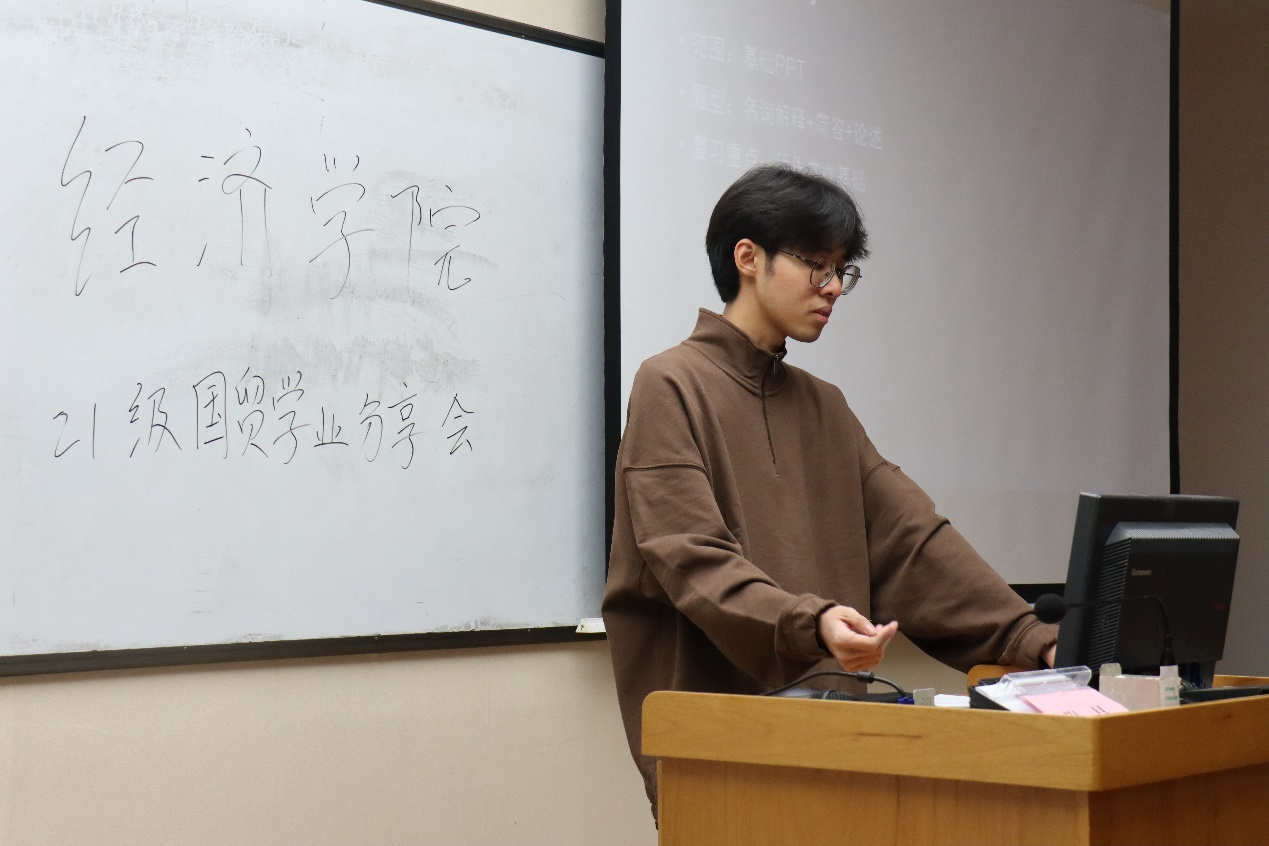 从琪润同学首先简单介绍了各个课程的授课特点,后对各个课程进行了逐一详细介绍,包括课程的学习重点、复习技巧和备考经验等。他提到,对于国际贸易学,要重点总结老师课件的内容,对于老师拓展的有关高级贸易的知识了解即可,并强调在日常的学习中要注意积累名词解释;而对于国际金融学,他重点强调了考试题型中的计算题和论述题,并以此说明了日常关注老师课件重点内容的重要性;对于世界经济学,他建议同学们重点关注老师强调的考察范围,有针对性地学习和备考;而对于国际市场营销和跨国公司经营与管理,从琪润同学特别强调了上课认真听讲的重要性,提到了课程的学习侧重于老师的讲授和课下对于老师教授内容的整理。此外,他也对于同学们提出的问题进行了详细的解答,包括对于保研相关经验的分享。从琪润同学用自己不断奋斗的经历,鼓励2021级的同学迎难而上、坚持到底,在分享学术经验之外,也坚定了同学们的拼搏信念。