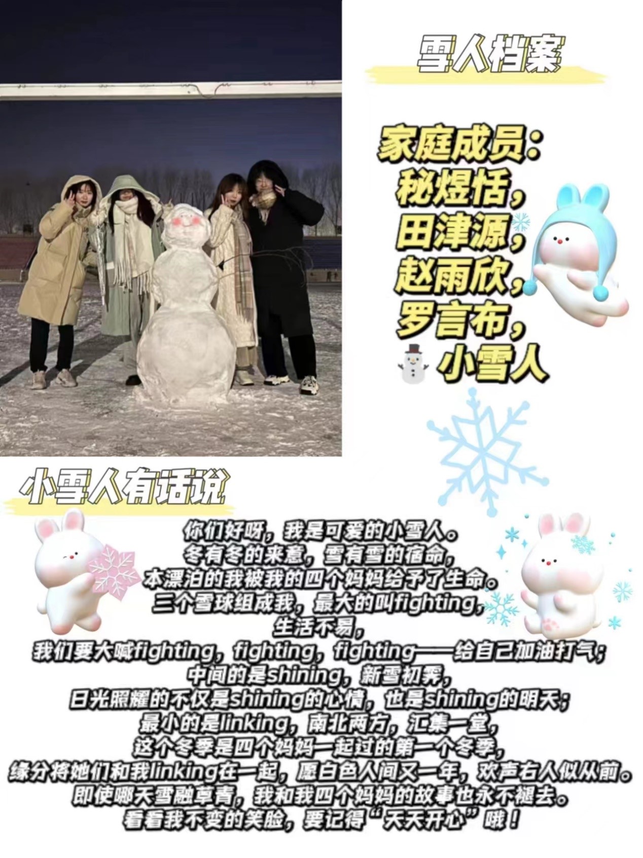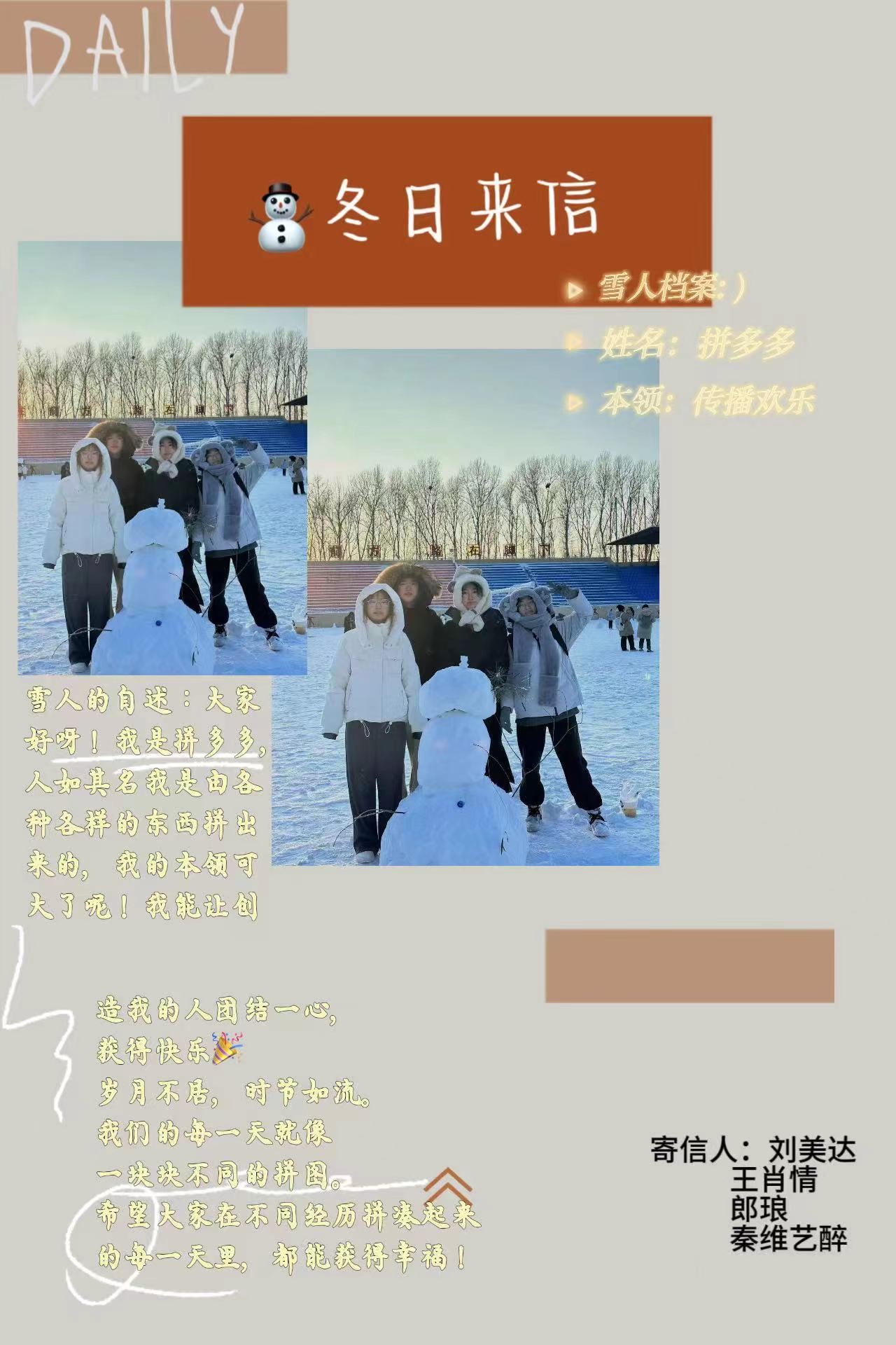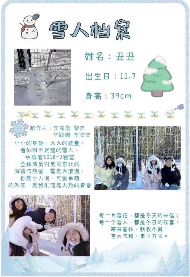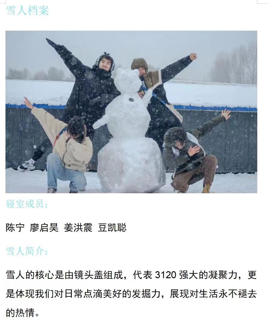 在此次活动中,同学们热情高涨,积极踊跃参与到堆雪人的活动中。在同学们的共同努力下,一个个栩栩如生的雪人呈现在我们面前,令人赞叹不已。这些雪人不仅展示了他们的创意,也见证了他们的团结协作精神。每个宿舍也为自己的雪人设计了精彩纷呈的雪人档案,里面有各种各样的奇思妙想,反映出同学们积极向上的精神面貌。