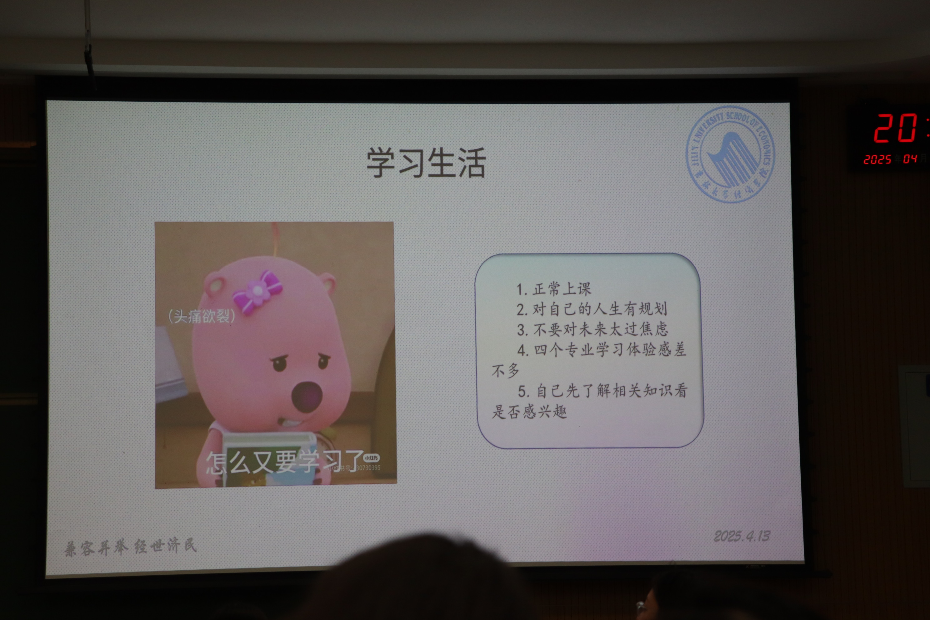 金融专业的张澜桐学姐则聚焦金融行业的就业与考研情况。学姐表示,金融行业前景广阔,但本科生岗位相对较少,提升学历是增强竞争力的有效途径。在就业建议上,学姐强调“实习 > 考证”,鼓励同学们尽早在金融、互联网等热门方向积累实习经验,同时掌握Excel、Python等工具,考取相关从业资格证书。