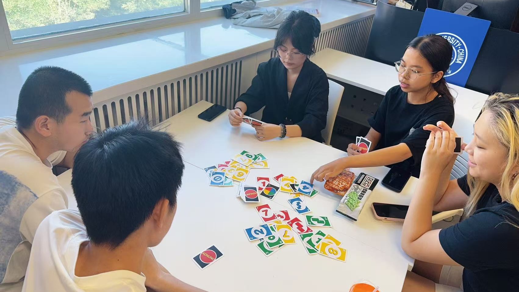 活动以分组游戏拉开帷幕。根据前期调研,全班同学被分为若干小组,分别开展逻辑推理游戏“狼人杀”与趣味卡牌游戏“UNO”。狼人杀现场,同学们化身不同角色,在推理与博弈中展开智力交锋,从拘谨到投入,逻辑碰撞与幽默互动交织,默契与信任悄然建立;UNO游戏区则轻松活泼,无论新手老手皆全情参与,卡牌策略与局势变化引发阵阵欢笑。沉浸式游戏体验让陌生感消融,友谊在协作与欢笑中生根发芽。