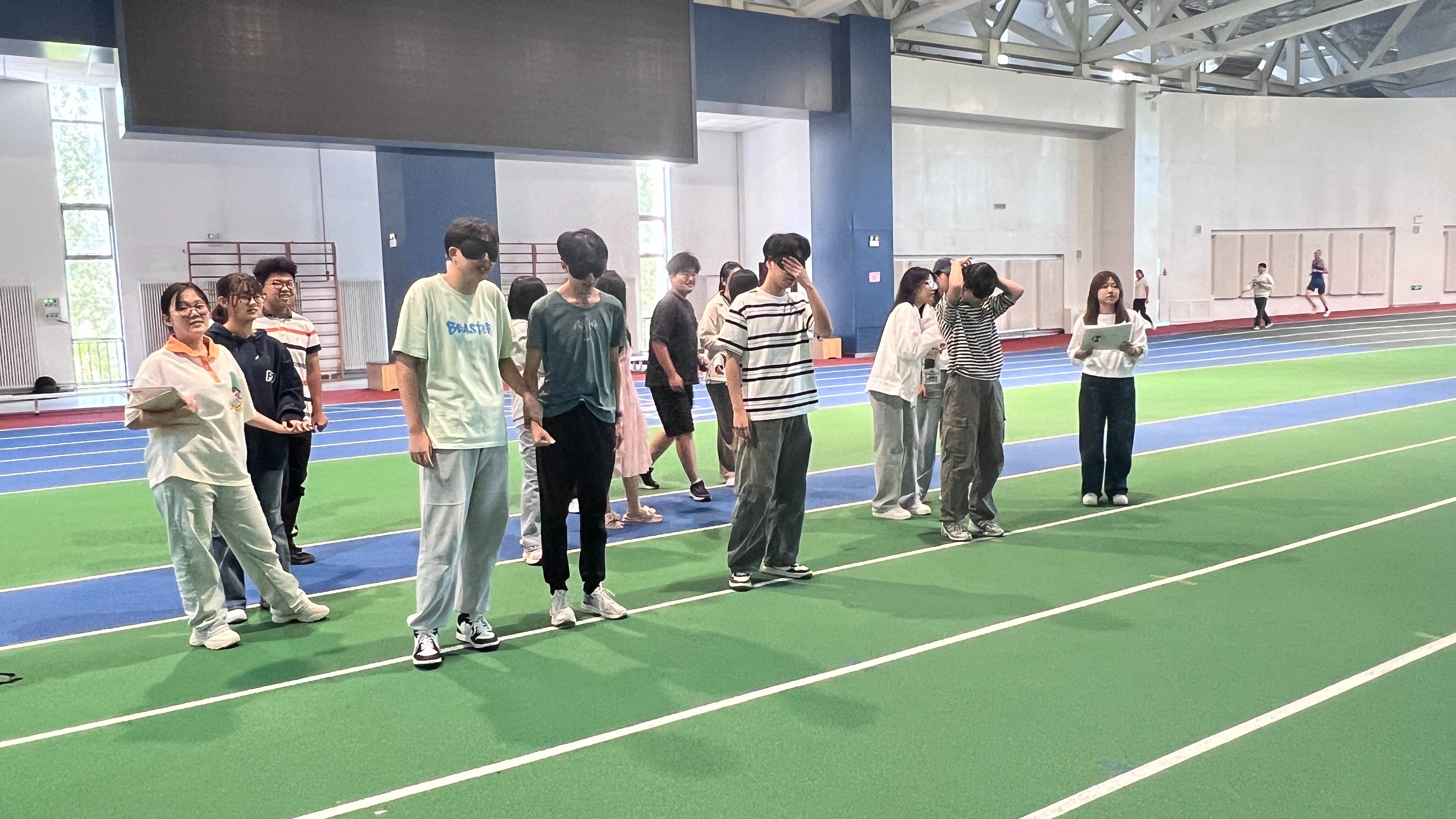“蒙眼跑步”将活动推向高潮。各组代表蒙眼完成50米挑战,胜负规则神秘多变,仅非参赛队员知晓。赛场上,有人默契指引、相互搀扶,有人勇往直前,亦有人巧用“烟雾弹”策略,场边加油声与欢笑声此起彼伏。同学们在协作与竞争中敞开心扉,心与心的距离悄然拉近。