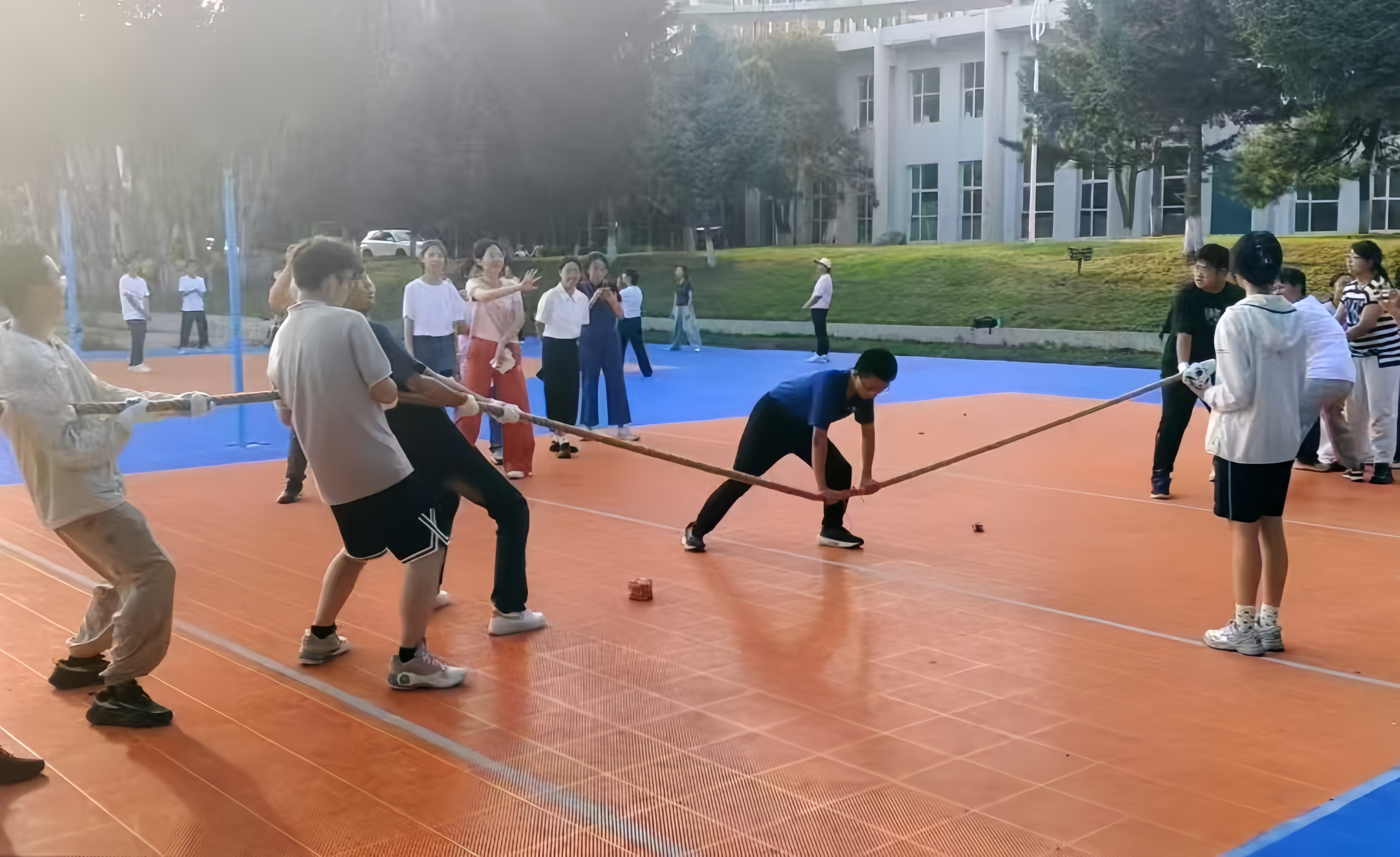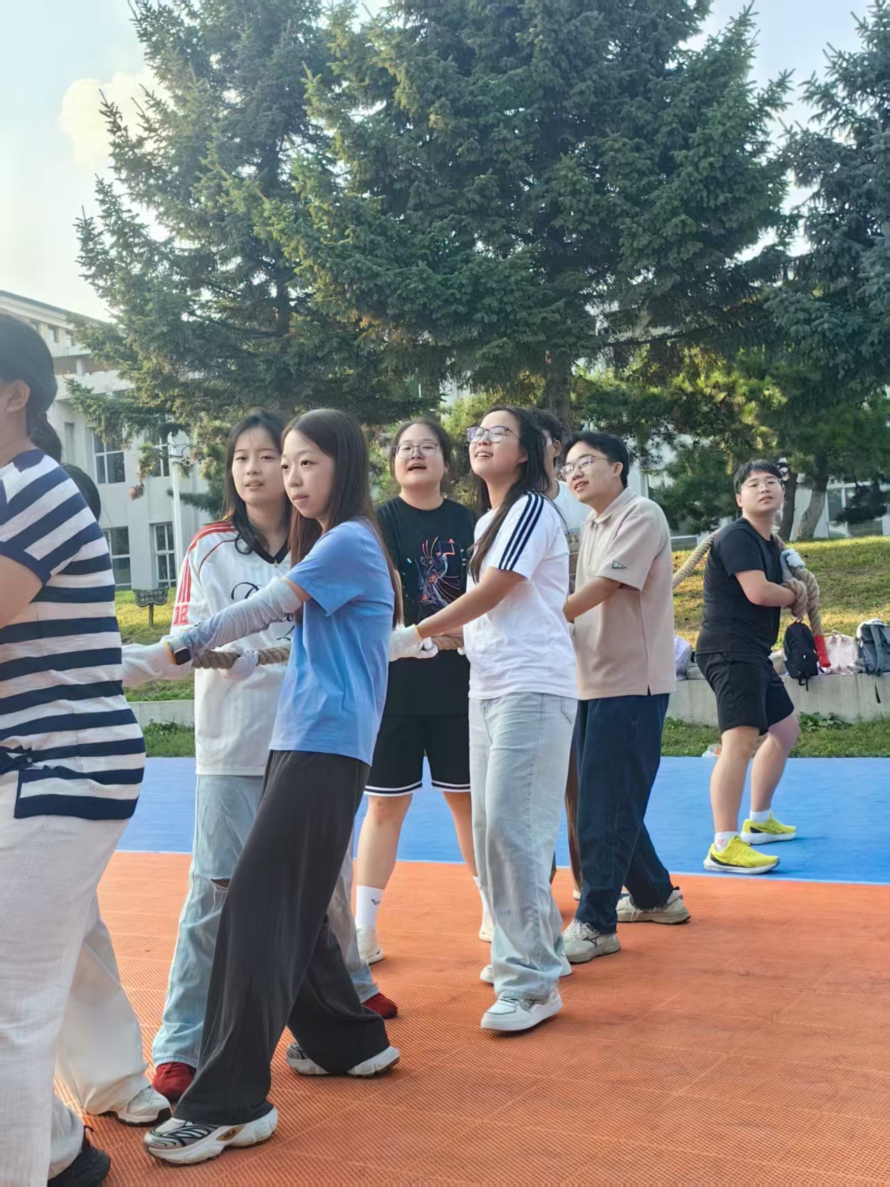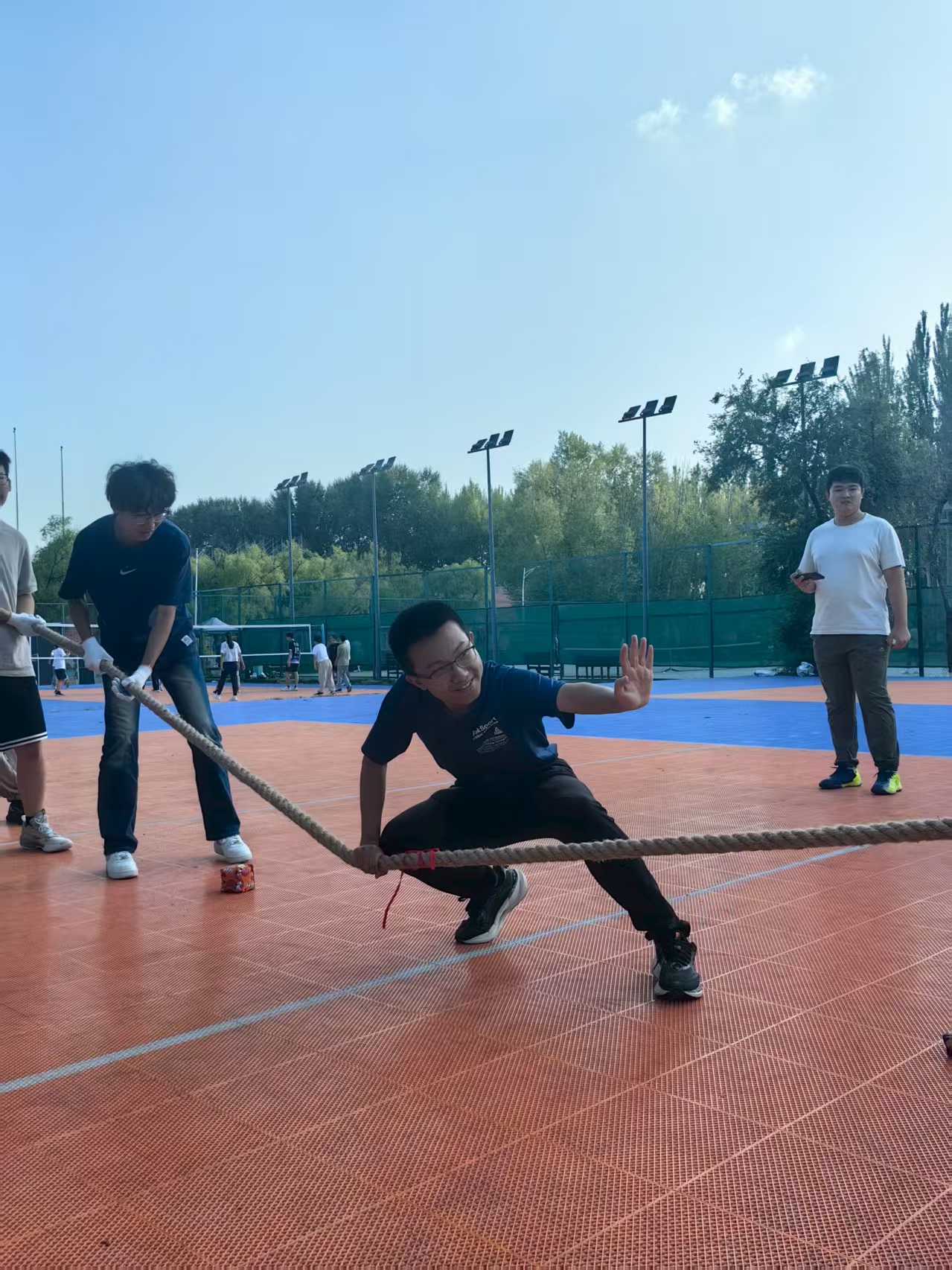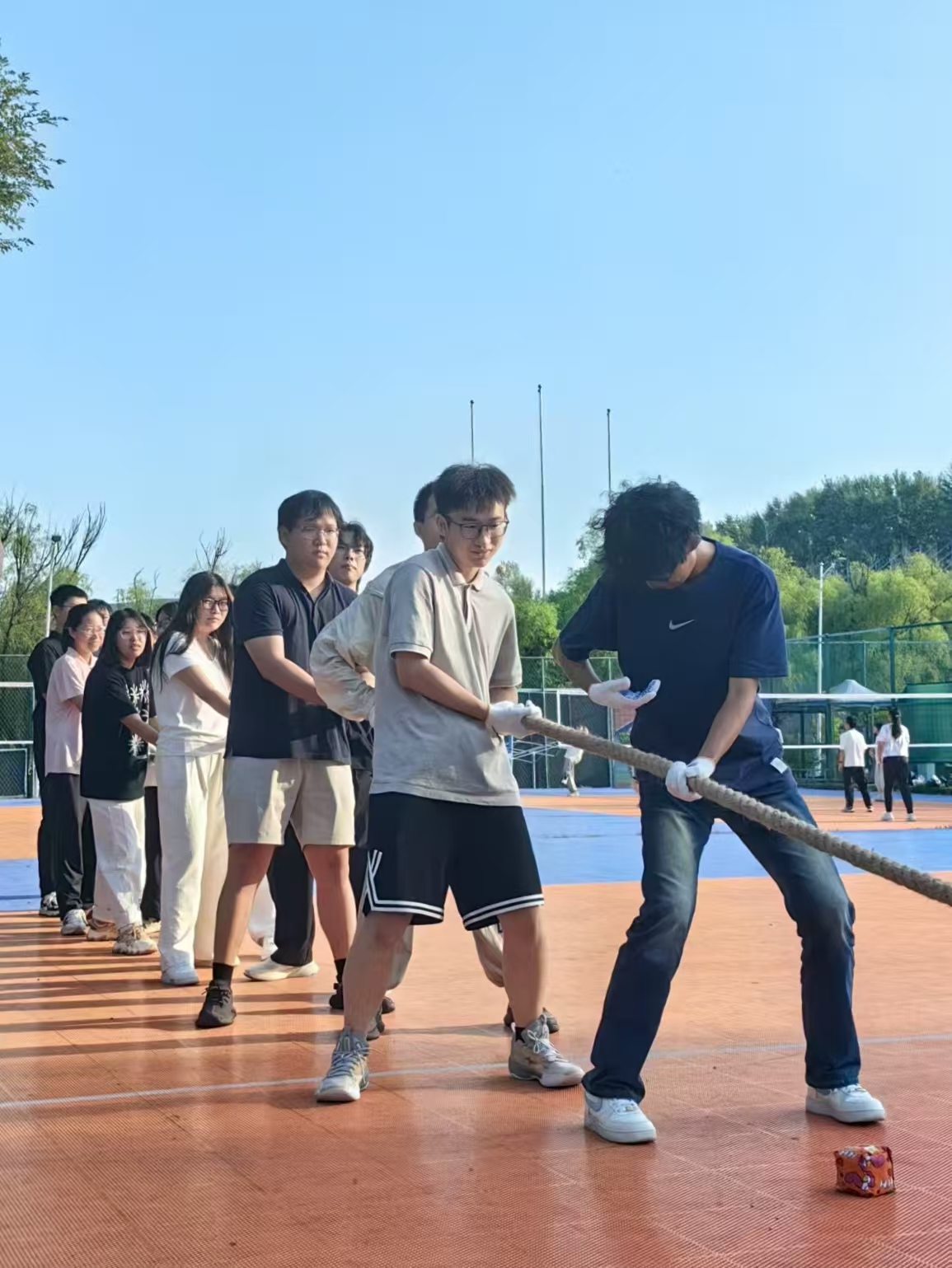 首个活动项目为拔河比赛,同学们按照各班男女比例均衡地分成两队,以排球场地面标线及拔河红绳作为胜负标的,参赛队伍将红布拉过本方决胜线即获胜一局,赛制采用“三局两胜”制。在简单热身准备及分发好保护手套后,由梁宇杰同学执中间红绳,比赛正式开始。两队队员紧握绳索、脚蹬地面,场外同学组欢呼助威,加油声、呐喊声此起彼伏大绳所系红绳在“一二一二”的节奏声中左右横跳,场面十分焦灼;经过两局精彩对决,两队决出了胜负,随后双方队员友好交流,展现了良好的团队风貌。
